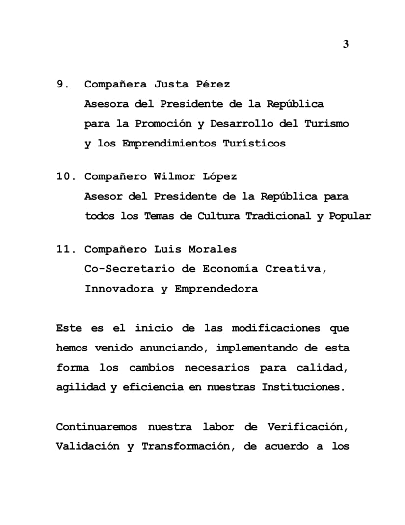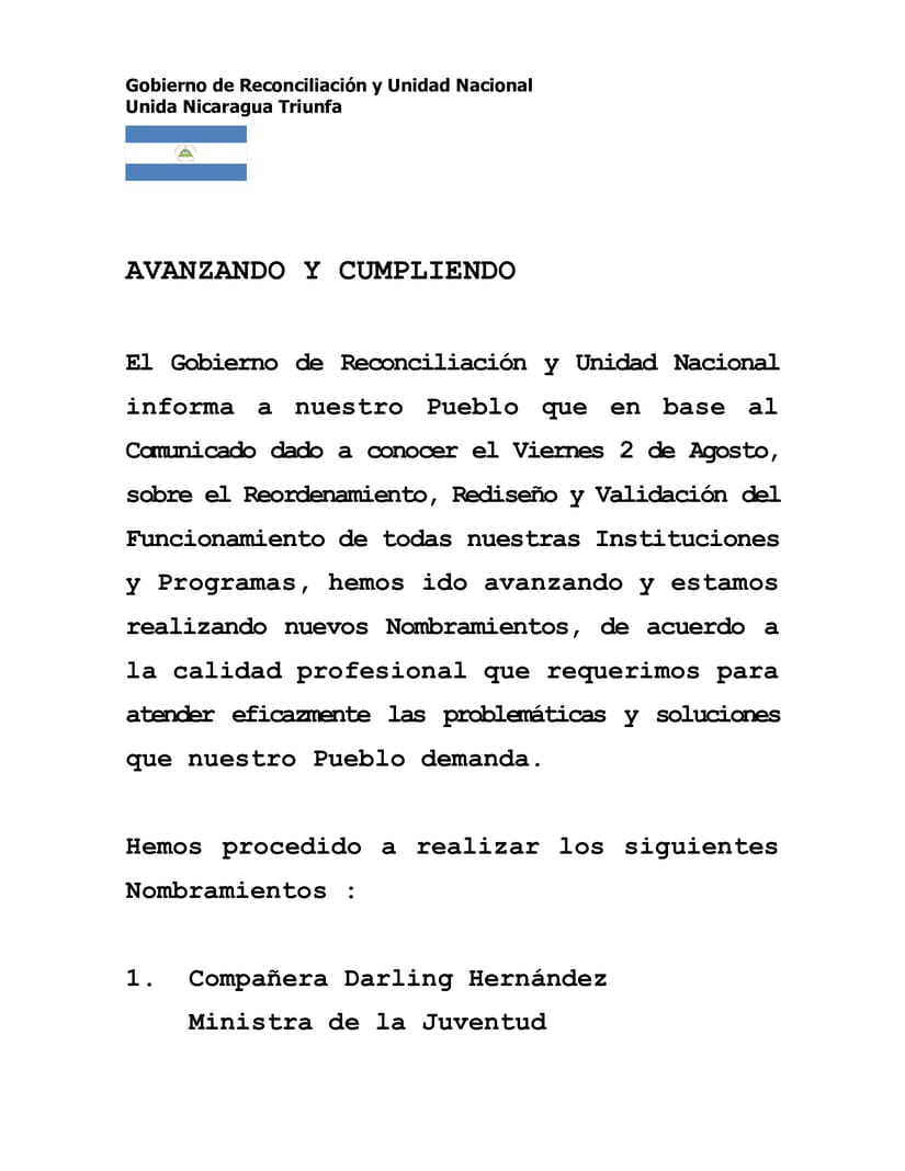 El Gobierno de Reconciliación y Unidad Nacional informa a nuestro Pueblo que en base al Comunicado dado a conocer el Viernes 2 de Agosto, sobre el Reordenamiento, Rediseño y Validación del Funcionamiento de todas nuestras Instituciones y Programas, hemos ido avanzando y estamos realizando nuevos Nombramientos, de acuerdo a la calidad profesional que requerimos para atender eficazmente las problemáticas y soluciones que nuestro Pueblo demanda.