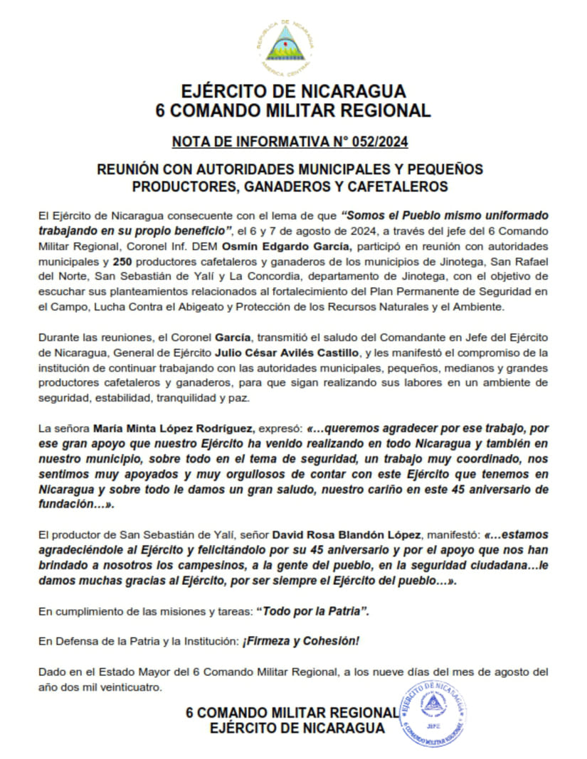 El Ejército de Nicaragua consecuente con el lema de que “Somos el Pueblo mismo uniformado trabajando en su propio beneficio”, el 6 y 7 de agosto de 2024, a través del jefe del 6 Comando Militar Regional, Coronel Inf. DEM Osmín Edgardo García, participó en reunión con autoridades municipales y 250 productores cafetaleros y ganaderos de los municipios de Jinotega, San Rafael del Norte, San Sebastián de Yalí y La Concordia, departamento de Jinotega, con el objetivo de escuchar sus planteamientos relacionados al fortalecimiento del Plan Permanente de Seguridad en el Campo, Lucha Contra el Abigeato y Protección de los Recursos Naturales y el Ambiente.
