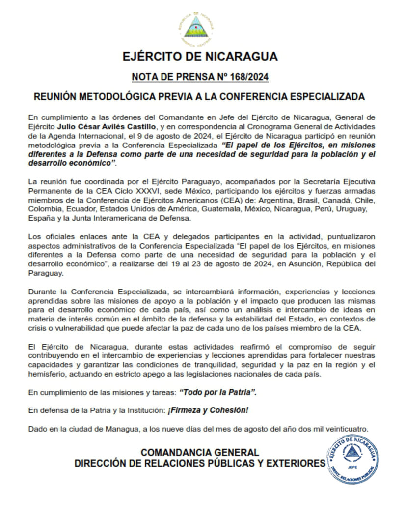 En cumplimiento a las órdenes del Comandante en Jefe del Ejército de Nicaragua, General de Ejército Julio César Avilés Castillo, y en correspondencia al Cronograma General de Actividades de la Agenda Internacional, el 9 de agosto de 2024, el Ejército de Nicaragua participó en reunión metodológica previa a la Conferencia Especializada “El papel de los Ejércitos, en misiones diferentes a la Defensa como parte de una necesidad de seguridad para la población y el desarrollo económico”.