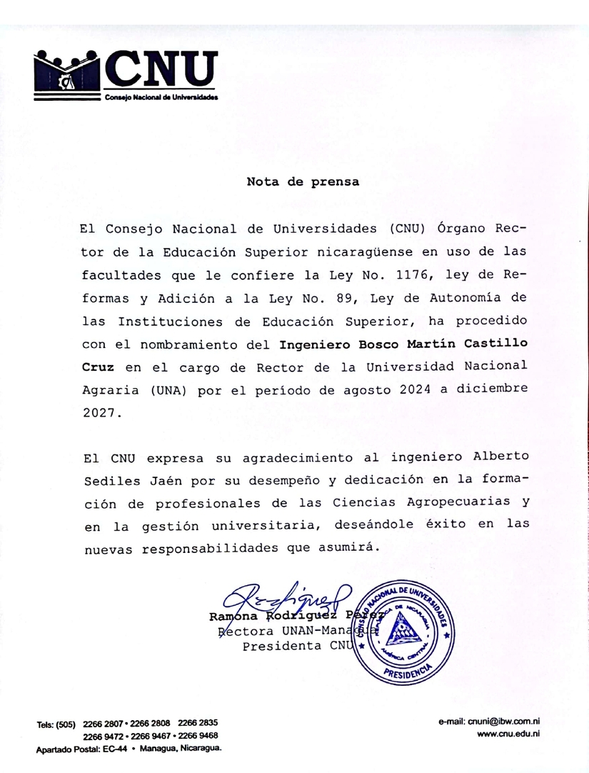 Nota de Prensa del CNU, referida al Nombramiento del Ingeniero Bosco Castillo Cruz, como Rector de la Universidad Agraria, UNA.