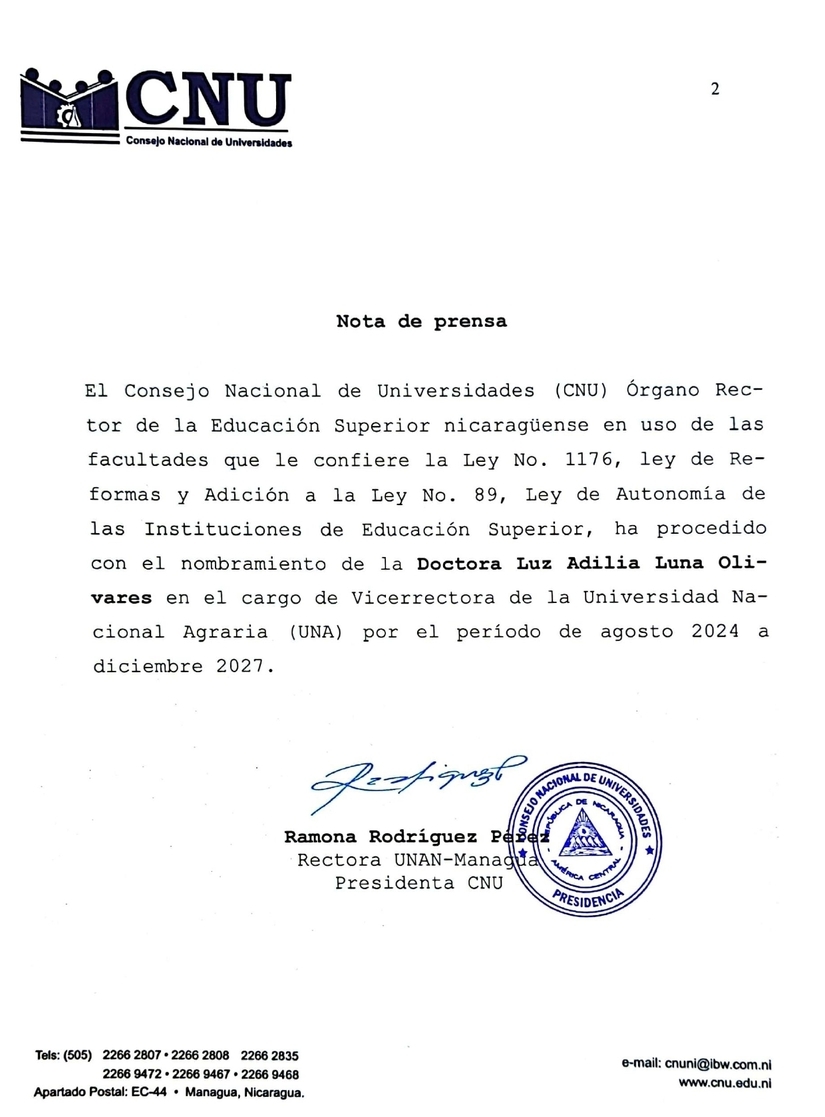 Nota de Prensa del CNU, referida al Nombramiento de la Doctora Luz Adilia Luna Olivares, como Vicerrectora de la Universidad Agraria, UNA.