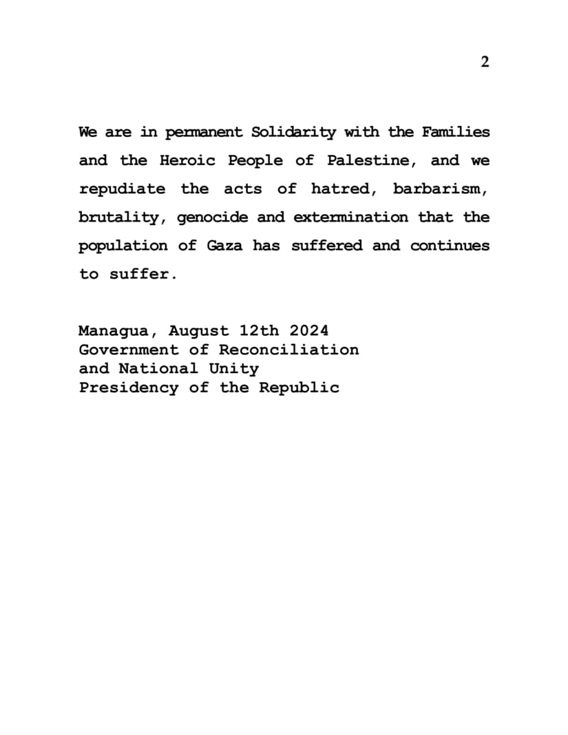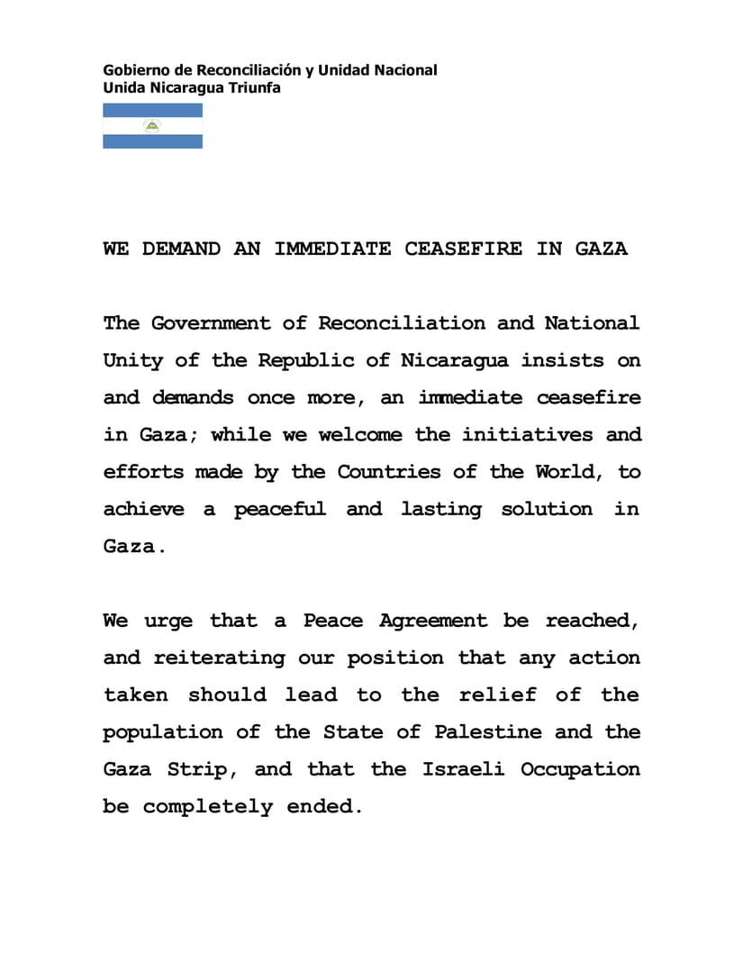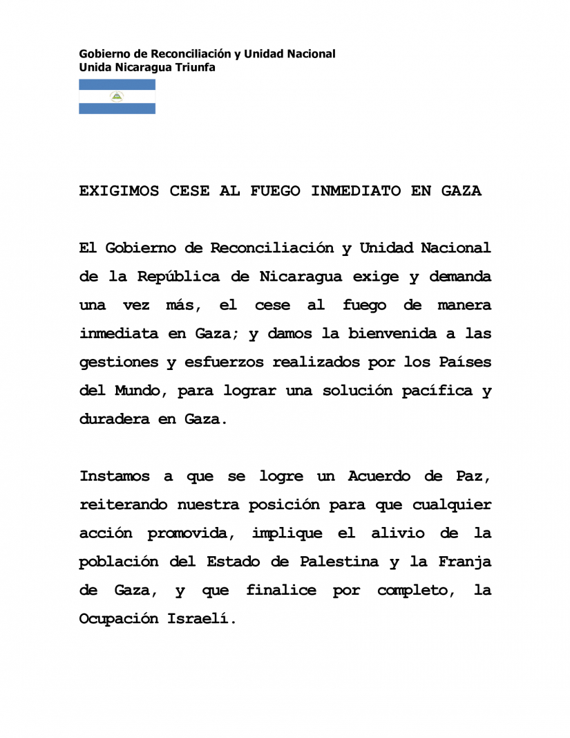 El Gobierno de Reconciliación y Unidad Nacional de la República de Nicaragua exige y demanda una vez más, el cese al fuego de manera inmediata en Gaza; y damos la bienvenida a las gestiones y esfuerzos realizados por los Países del Mundo, para lograr una solución pacífica y duradera en Gaza.