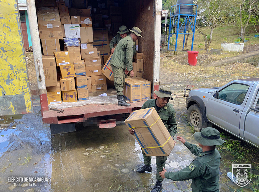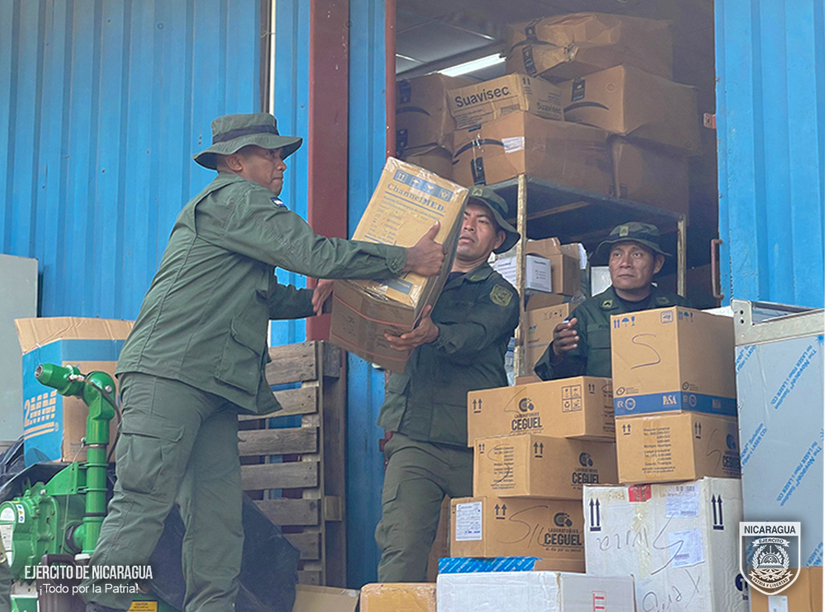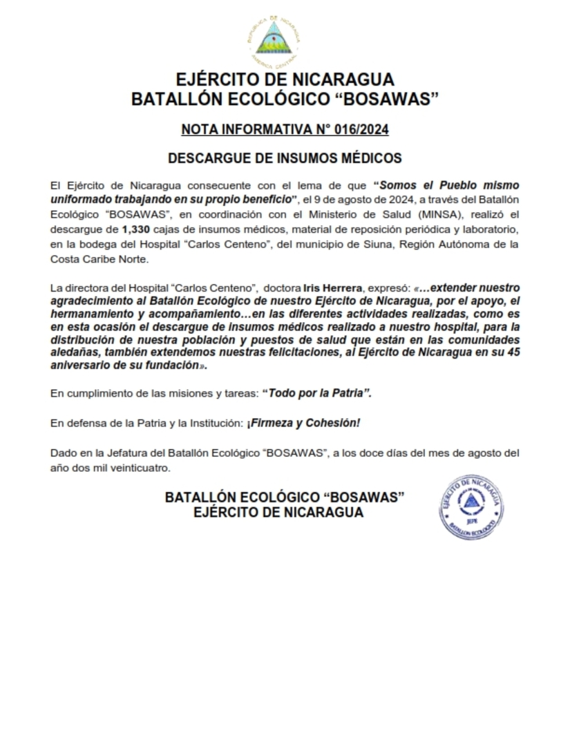 El Ejército de Nicaragua consecuente con el lema de que “Somos el Pueblo mismo uniformado trabajando en su propio beneficio”, el 9 de agosto de 2024, a través del Batallón Ecológico “BOSAWAS”, en coordinación con el Ministerio de Salud (MINSA), realizó el descargue de 1,330 cajas de insumos médicos, material de reposición periódica y laboratorio, en la bodega del Hospital “Carlos Centeno”, del municipio de Siuna, Región Autónoma de la Costa Caribe Norte.