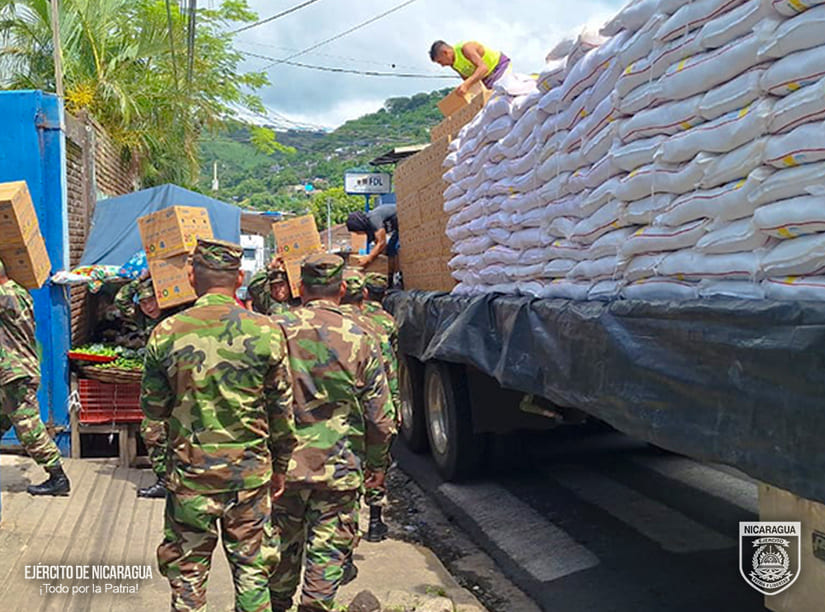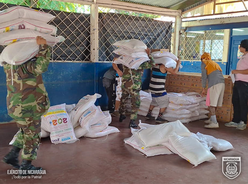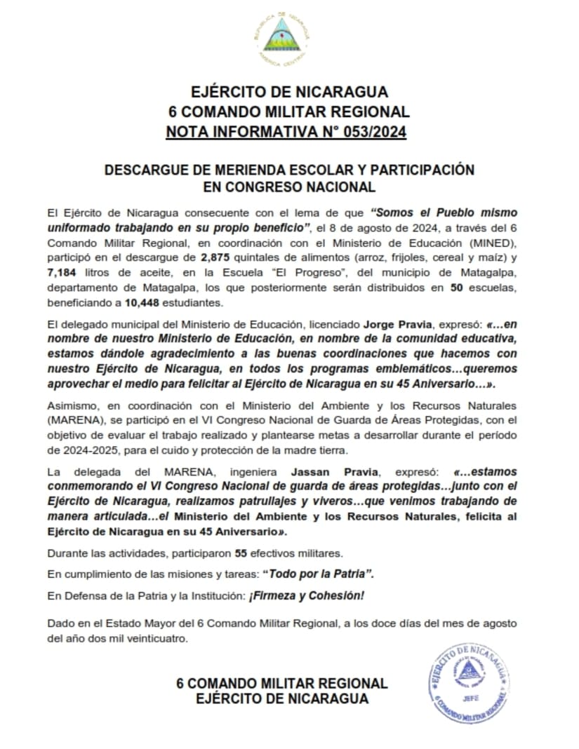El Ejército de Nicaragua consecuente con el lema de que “Somos el Pueblo mismo uniformado trabajando en su propio beneficio”, el 8 de agosto de 2024, a través del 6 Comando Militar Regional, en coordinación con el Ministerio de Educación (MINED), participó en el descargue de 2,875 quintales de alimentos (arroz, frijoles, cereal y maíz) y 7,184 litros de aceite, en la Escuela “El Progreso”, del municipio de Matagalpa, departamento de Matagalpa, los que posteriormente serán distribuidos en 50 escuelas, beneficiando a 10,448 estudiantes.