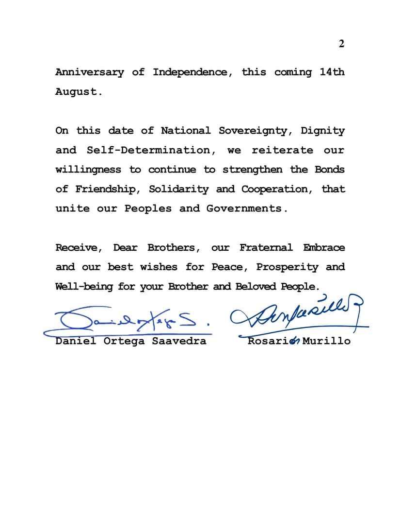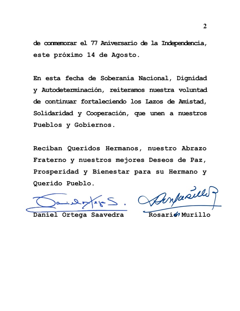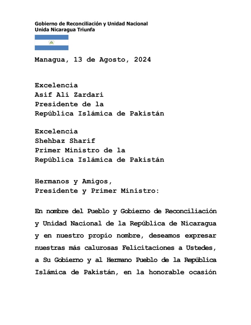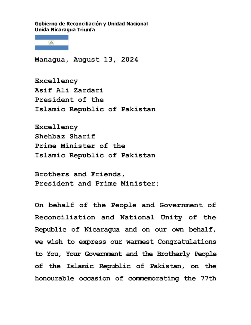 En nombre del Pueblo y Gobierno de Reconciliación y Unidad Nacional de la República de Nicaragua y en nuestro propio nombre, deseamos expresar nuestras más calurosas Felicitaciones a Ustedes, a Su Gobierno y al Hermano Pueblo de la República Islámica de Pakistán, en la honorable ocasión de conmemorar el 77 Aniversario de la Independencia, este próximo 14 de Agosto.