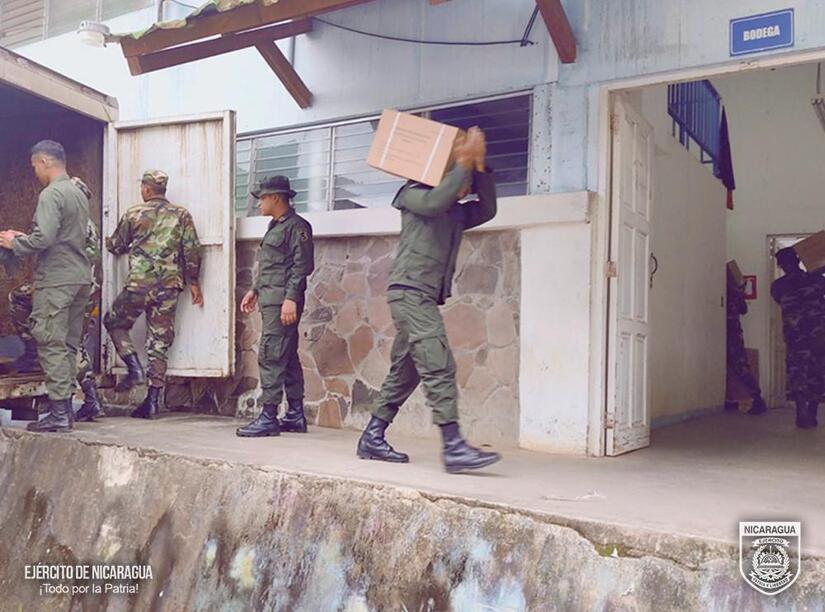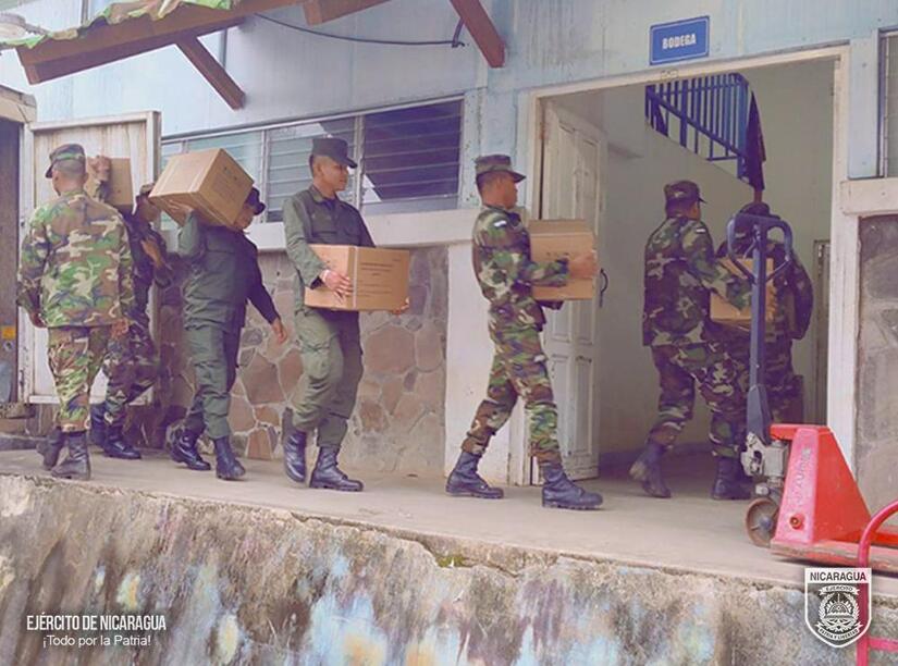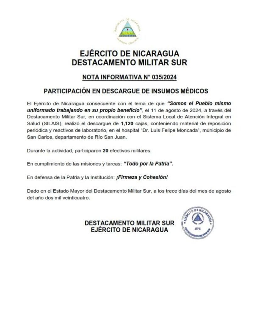 El Ejército de Nicaragua consecuente con el lema de que "Somos el Pueblo mismo uniformado trabajando en su propio beneficio", el 11 de agosto de 2024, a través del Destacamento Militar Sur, en coordinación con el Sistema Local de Atención Integral en Salud (SILAIS), realizó el descargue de 1,120 cajas, conteniendo material de reposición periódica y reactivos de laboratorio, en el hospital "Dr. Luis Felipe Moncada", municipio de San Carlos, departamento de Rio San Juan.