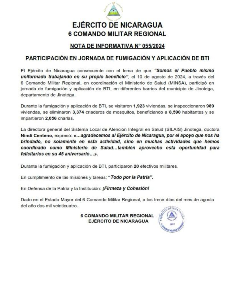 El Ejército de Nicaragua consecuente con el lema de que "Somos el Pueblo mismo uniformado trabajando en su propio beneficio", el 10 de agosto de 2024, a través del 6 Comando Militar Regional, en coordinación el Ministerio de Salud (MINSA), participó en jornada de fumigación y aplicación de BTI, en diferentes barrios del municipio de Jinotega, departamento de Jinotega.