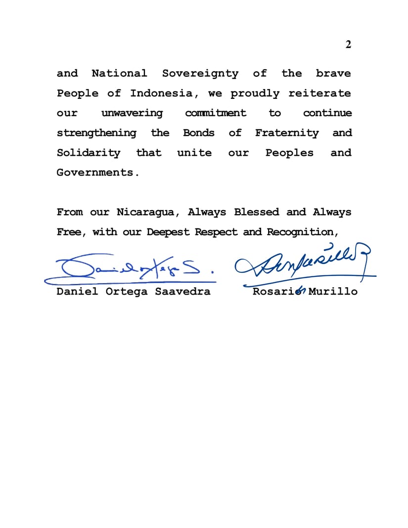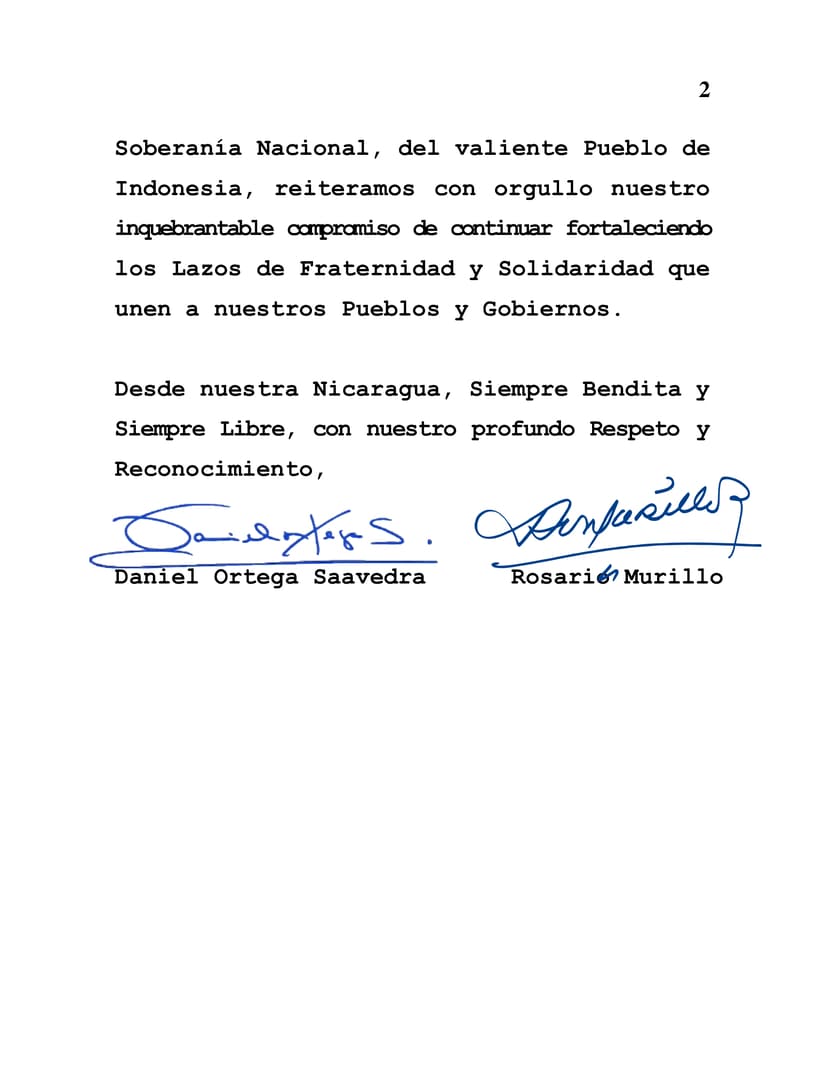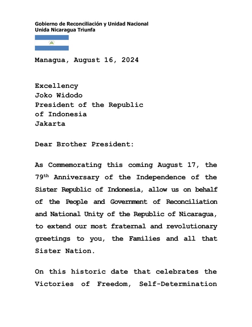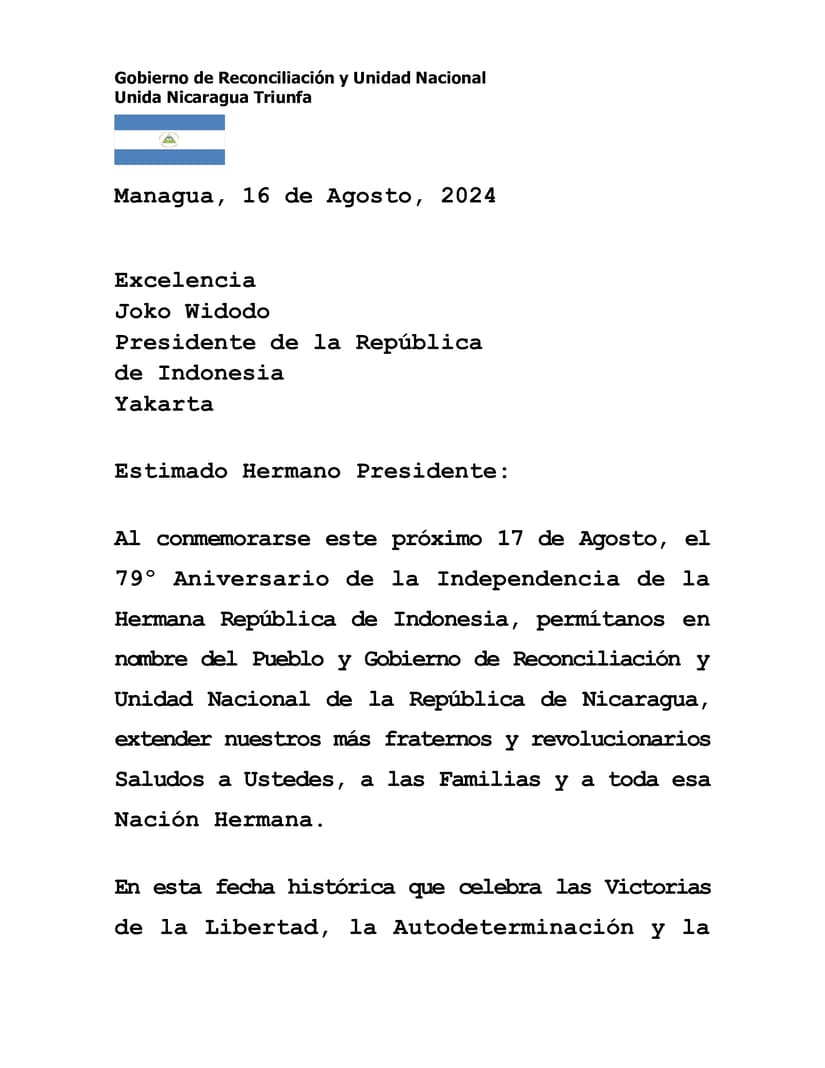 As Commemorating this coming August 17, the 79th Anniversary of the Independence of the Sister Republic of Indonesia, allow us on behalf of the People and Government of Reconciliation and National Unity of the Republic of Nicaragua, to extend our most fraternal and revolutionary greetings to you, the Families and all that Sister Nation.