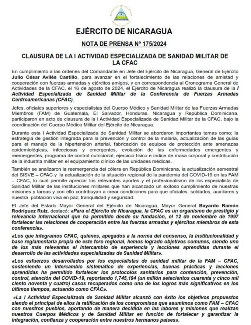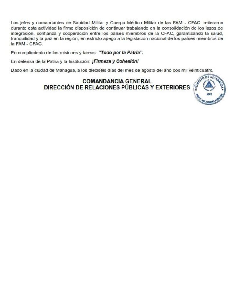En cumplimiento a las órdenes del Comandante en Jefe del Ejército de Nicaragua, General de Ejército Julio César Avilés Castillo, para avanzar en el fortalecimiento de las relaciones de amistad y cooperación con fuerzas armadas y ejércitos amigos, y en correspondencia al Cronograma General de Actividades de la CFAC, el 16 de agosto de 2024, el Ejército de Nicaragua realizó la clausura de la I Actividad Especializada de Sanidad Militar de la Conferencia de Fuerzas Armadas Centroamericanas (CFAC).