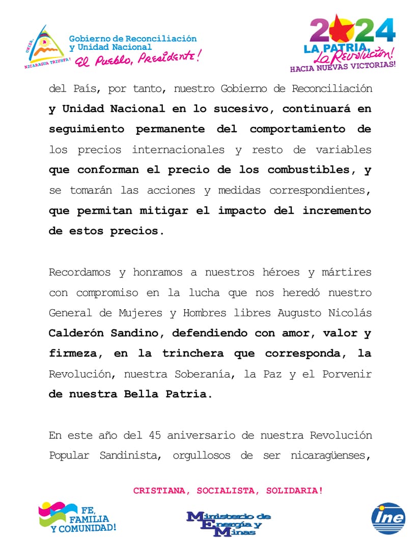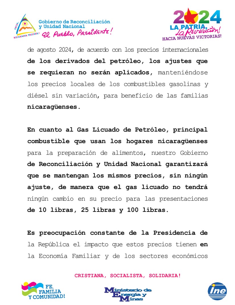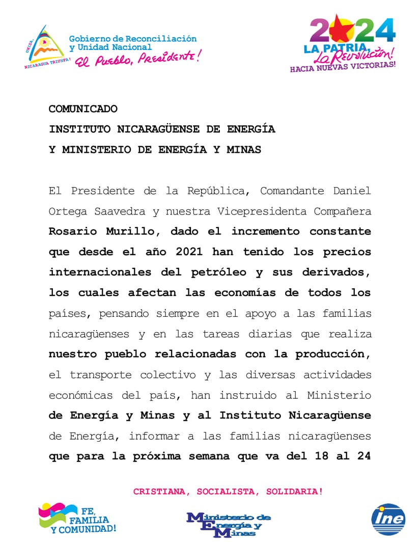 El Presidente de la República, Comandante Daniel Ortega Saavedra y nuestra Vicepresidenta Compañera Rosario Murillo, dado el incremento constante que desde el año 2021 han tenido los precios internacionales del petróleo y sus derivados, los cuales afectan las economías de todos los países, pensando siempre en el apoyo a las familias nicaragüenses y en las tareas diarias que realiza nuestro pueblo relacionadas con la producción, el transporte colectivo y las diversas actividades económicas del país, han instruido al Ministerio de Energía y Minas y al Instituto Nicaragüense de Energía, informar a las familias nicaragüenses que para la próxima semana que va del 18 al 24 de agosto 2024, de acuerdo con los precios internacionales de los derivados del petróleo, los ajustes que se requieran no serán aplicados, manteniéndose los precios locales de los combustibles gasolinas y diésel sin variación, para beneficio de las familias nicaragüenses.