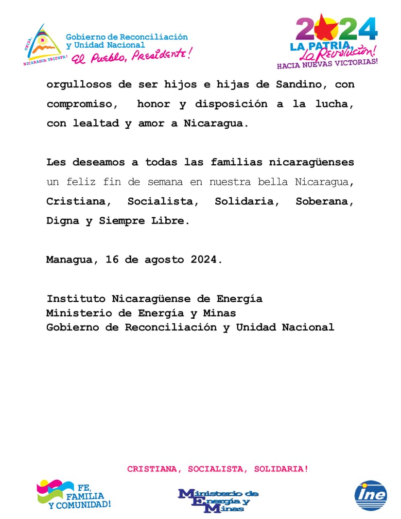 Les deseamos a todas las familias nicaragüenses un feliz fin de semana en nuestra bella Nicaragua, Cristiana, Socialista, Solidaria, Soberana, Digna y Siempre Libre.