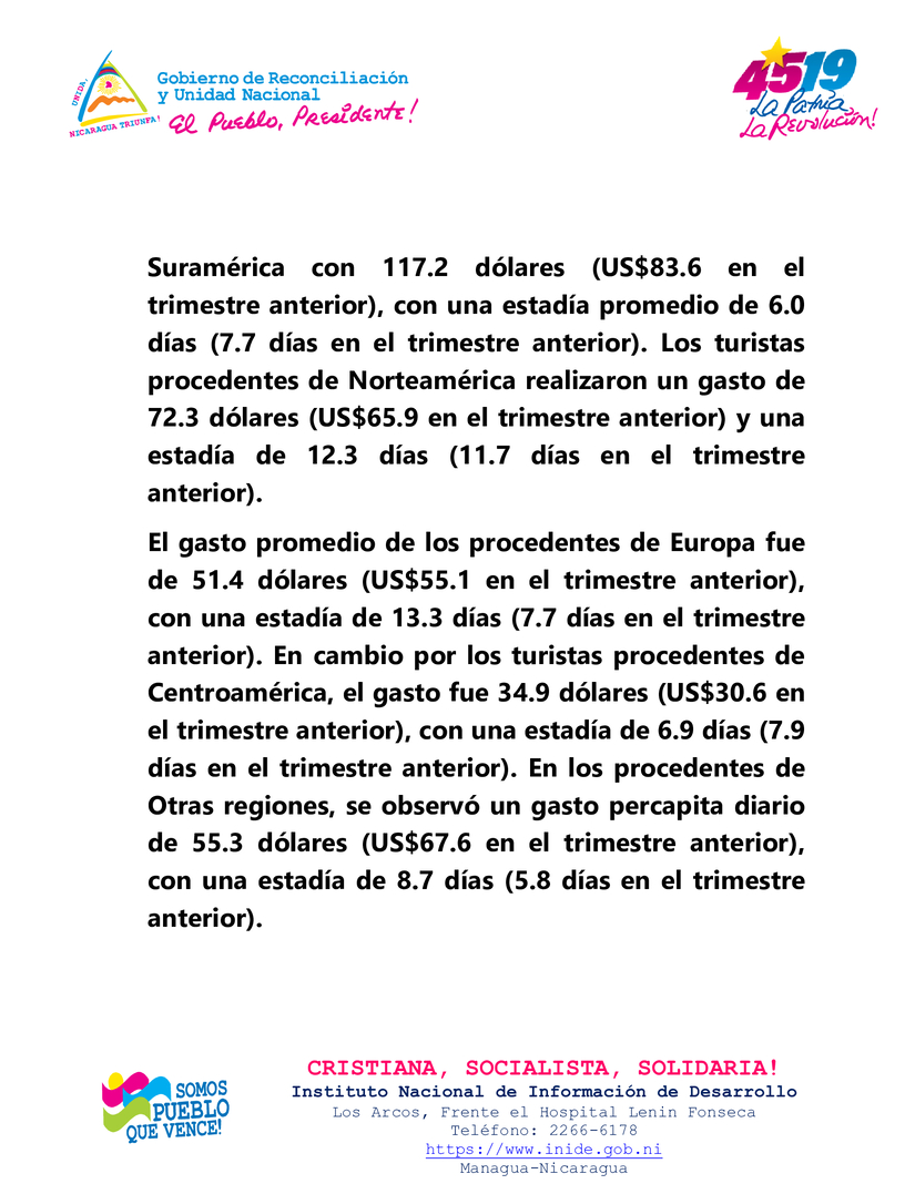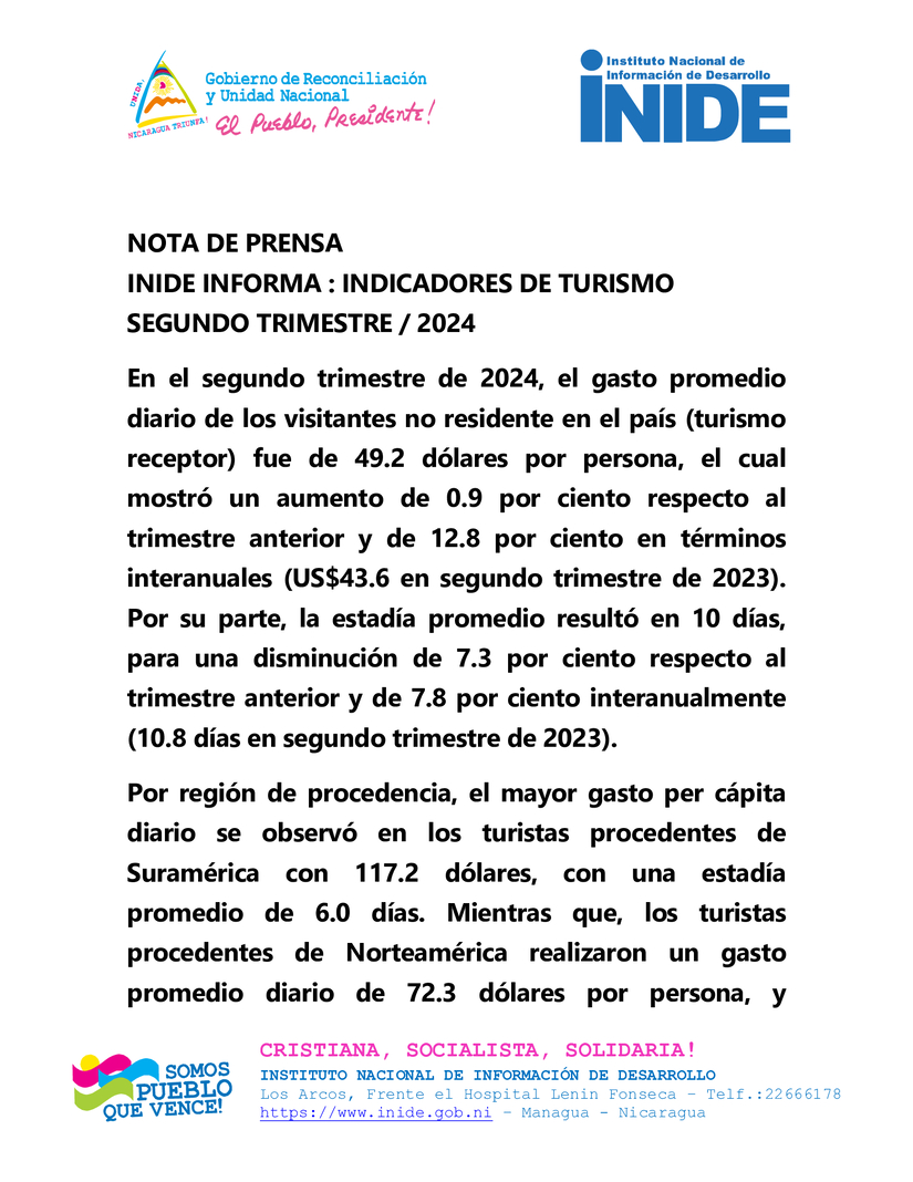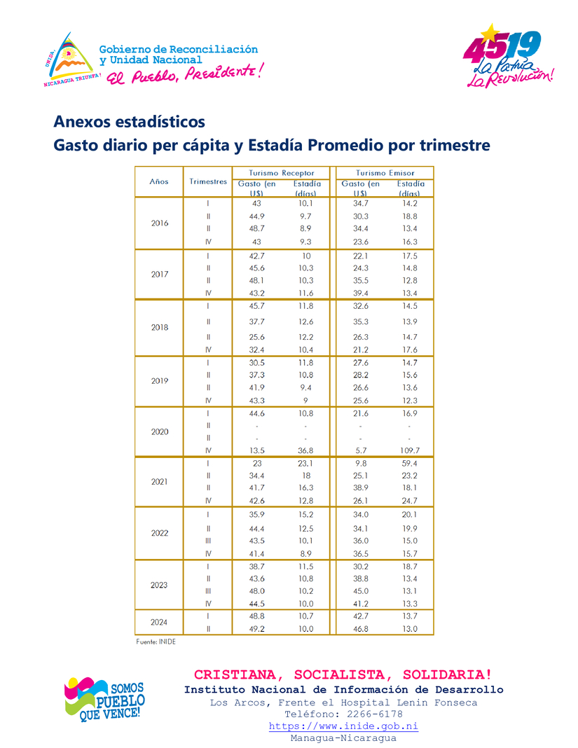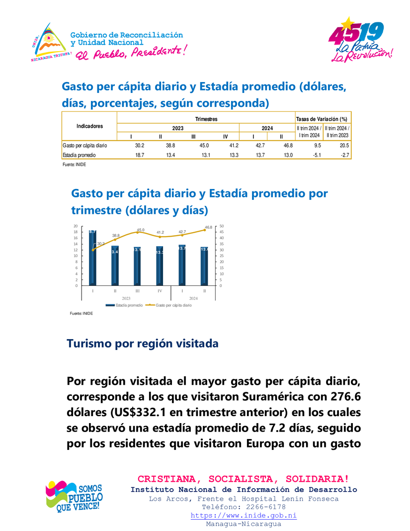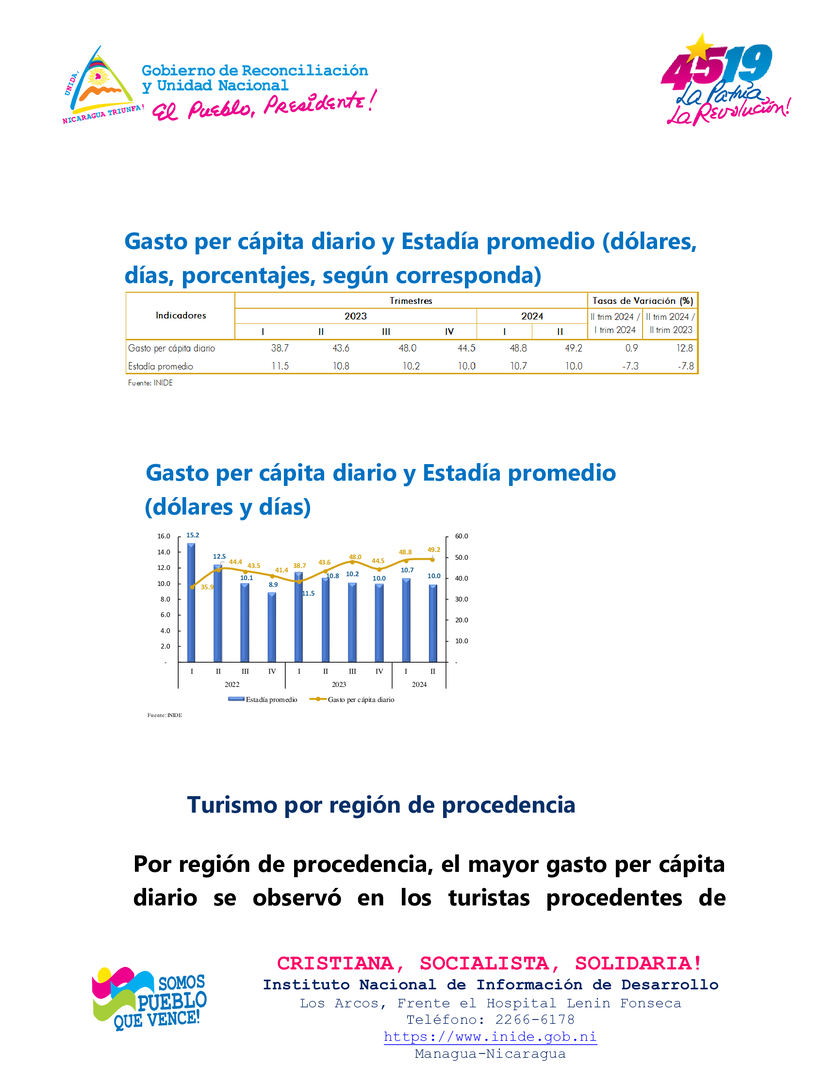 En el segundo trimestre de 2024, el gasto promedio diario de los visitantes no residente en el país (turismo receptor) fue de 49.2 dólares por persona, el cual mostró un aumento de 0.9 por ciento respecto al trimestre anterior y de 12.8 por ciento en términos interanuales (US$43.6 en segundo trimestre de 2023). Por su parte, la estadía promedio resultó en 10 días, para una disminución de 7.3 por ciento respecto al trimestre anterior y de 7.8 por ciento interanualmente (10.8 días en segundo trimestre de 2023).