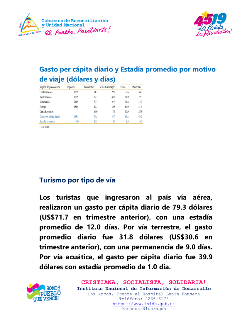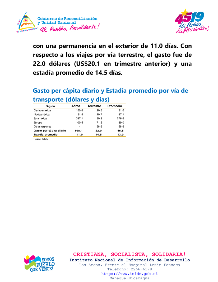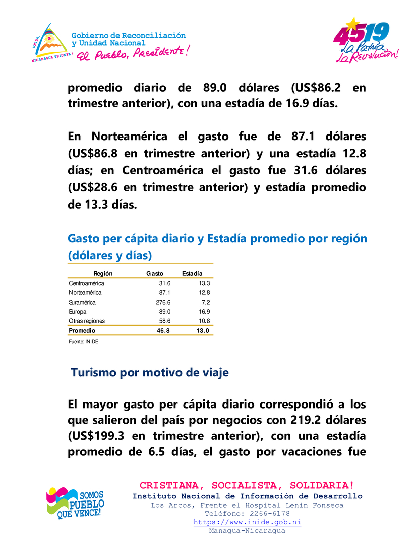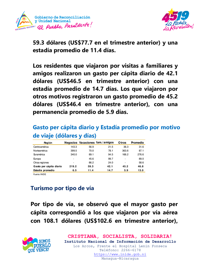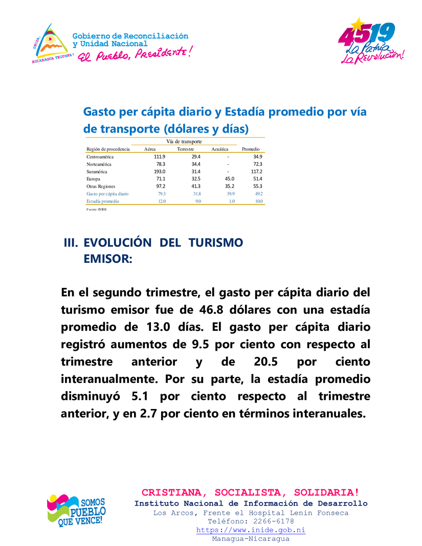 Entre tanto, el gasto promedio diario realizado por los turistas nacional en el exterior (turismo emisor) se ubicó en 46.8 dólares por persona, el cual aumentó en 9.5 por ciento respecto al trimestre anterior y en 20.5 por ciento interanualmente. Por su parte, la estadía promedio fue de 13 días, siendo menor en 5.1 por ciento respecto al trimestre anterior y en 2.7 por ciento en términos interanuales.