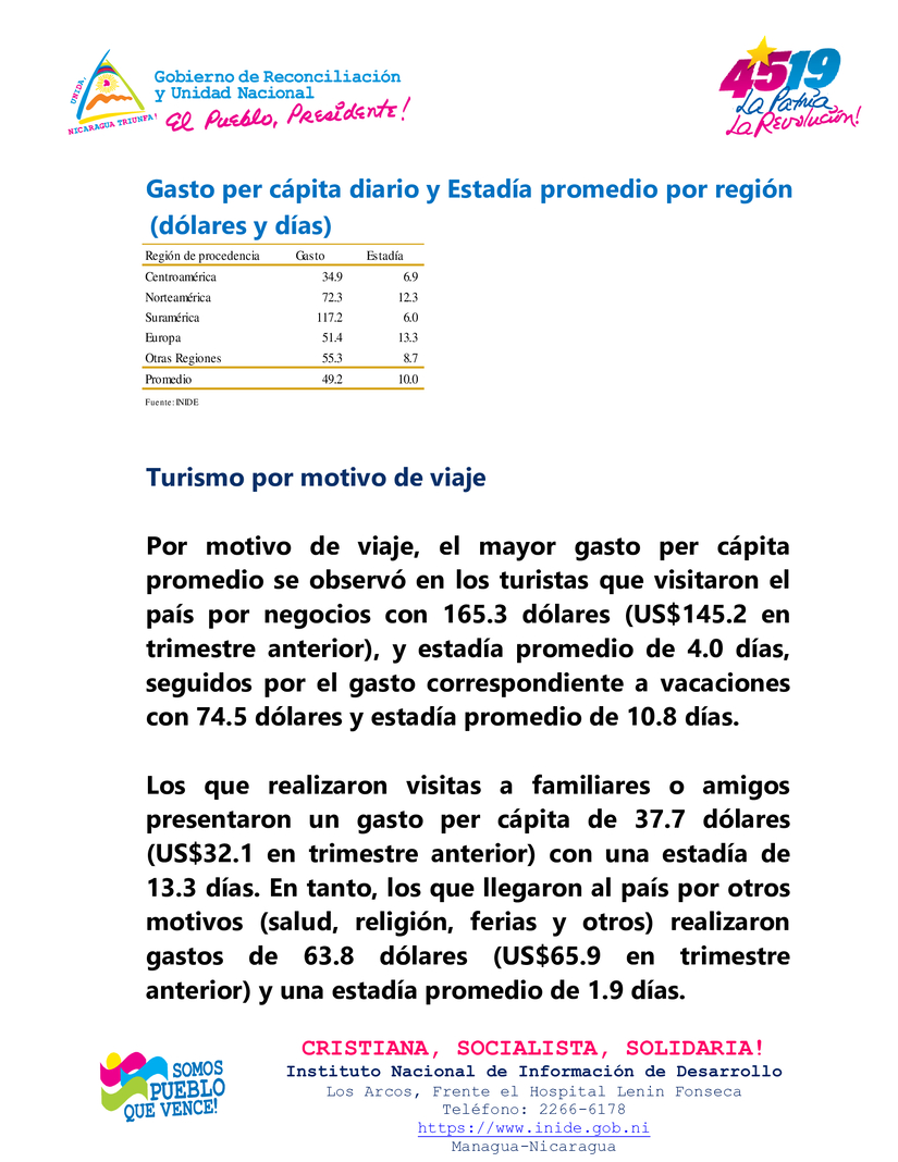 Por región de procedencia, el mayor gasto per cápita diario se observó en los turistas procedentes de Suramérica con 117.2 dólares, con una estadía promedio de 6.0 días. Mientras que, los turistas procedentes de Norteamérica realizaron un gasto promedio diario de 72.3 dólares por persona, y pernoctaron en promedio 12.3 días. El gasto promedio de los procedentes de Europa fue de 51.4 dólares, con una estadía de 13.3 días; y los procedentes de Centroamérica efectuaron un gasto promedio 34.9 dólares por persona, con una estadía de 6.9 días. Co respecto a los procedentes de otras regiones, se observó un gasto promedio diario de 55.3 dólares, con una estadía de 8.7 días.