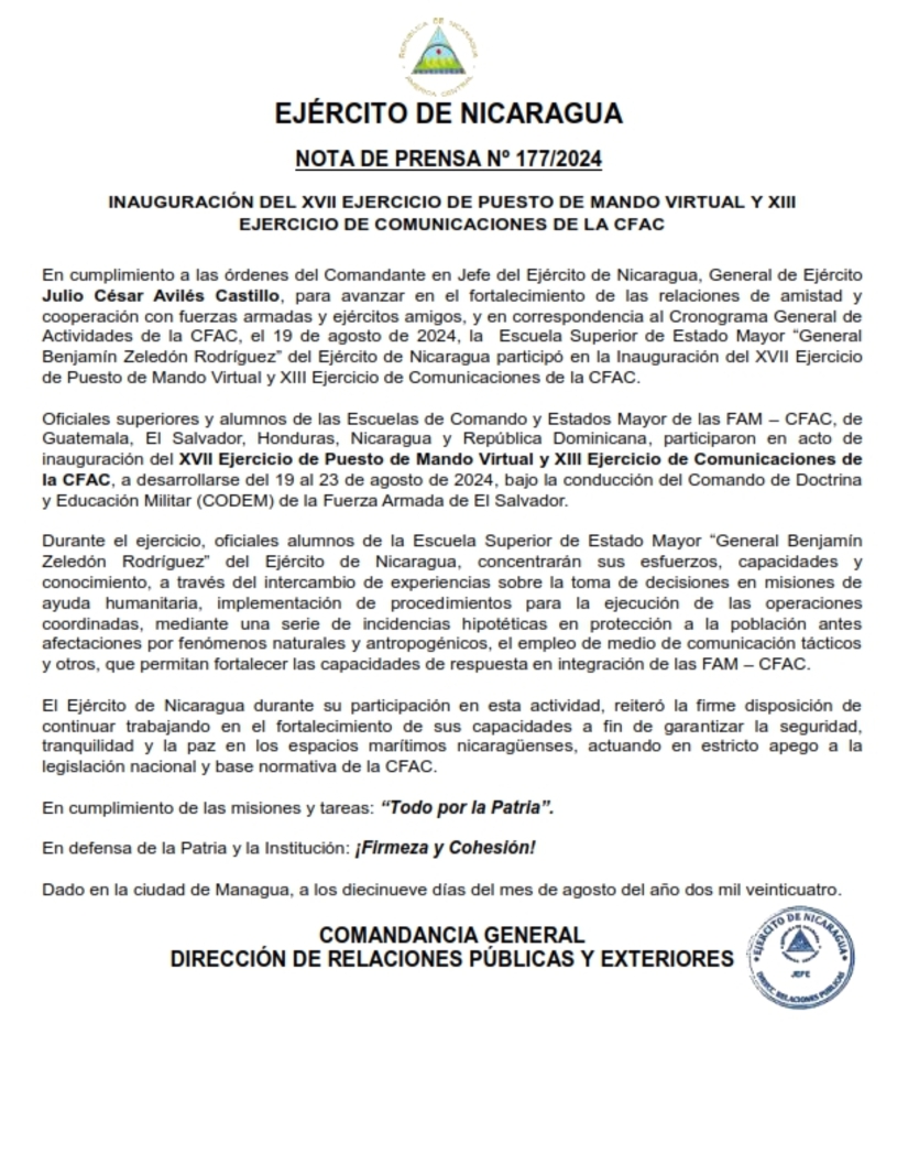 En cumplimiento a las órdenes del Comandante en Jefe del Ejército de Nicaragua, General de Ejército Julio César Avilés Castillo, para avanzar en el fortalecimiento de las relaciones de amistad y cooperación con fuerzas armadas y ejércitos amigos, y en correspondencia al Cronograma General de Actividades de la CFAC, el 19 de agosto de 2024, la Escuela Superior de Estado Mayor “General Benjamín Zeledón Rodríguez” del Ejército de Nicaragua participó en la Inauguración del XVII Ejercicio de Puesto de Mando Virtual y XIII Ejercicio de Comunicaciones de la CFAC.