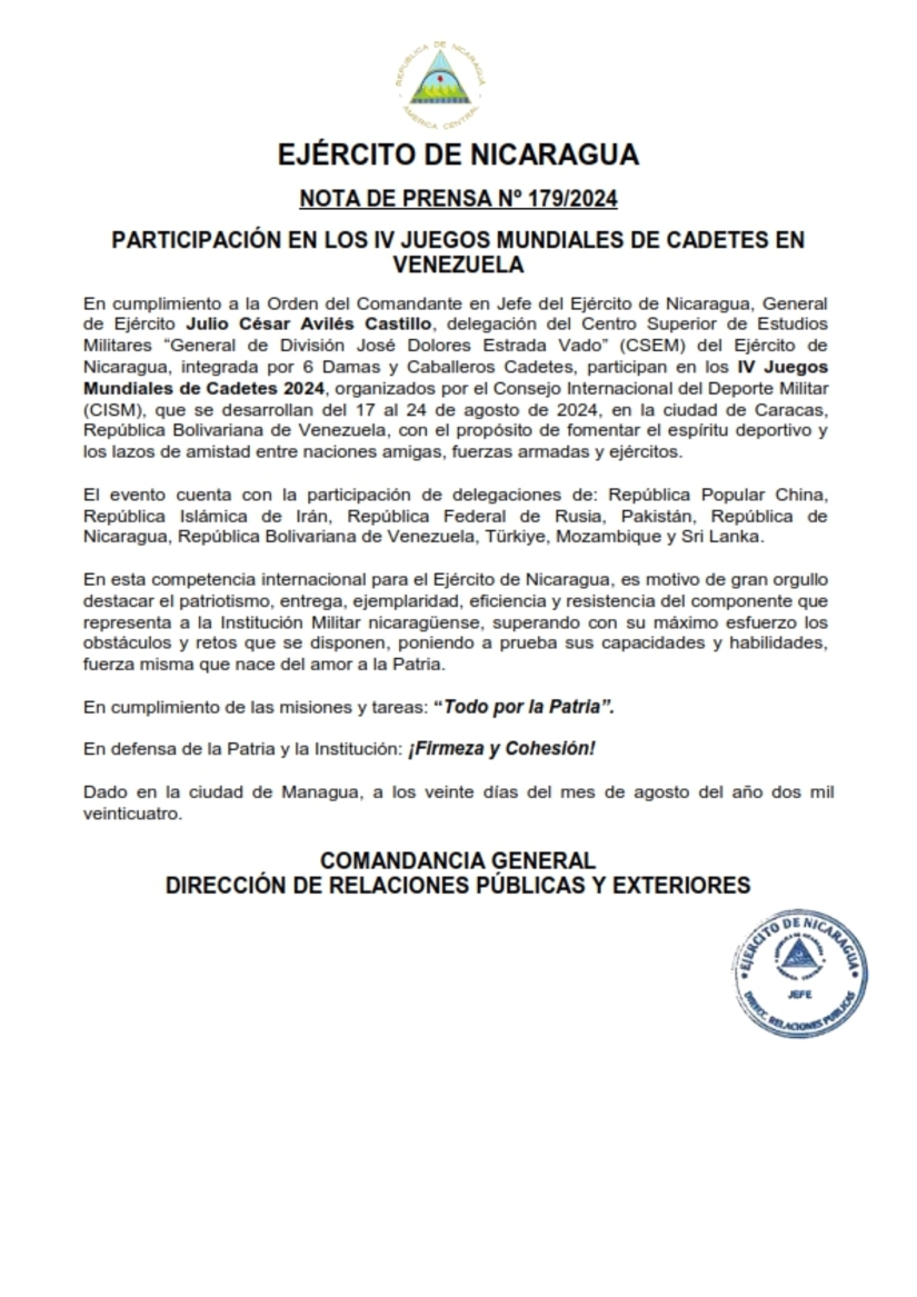 En cumplimiento a la Orden del Comandante en Jefe del Ejército de Nicaragua, General de Ejército Julio César Avilés Castillo, delegación del Centro Superior de Estudios Militares “General de División José Dolores Estrada Vado” (CSEM) del Ejército de Nicaragua, integrada por 6 Damas y Caballeros Cadetes, participan en los IV Juegos Mundiales de Cadetes 2024, organizados por el Consejo Internacional del Deporte Militar (CISM), que se desarrollan del 17 al 24 de agosto de 2024, en la ciudad de Caracas, República Bolivariana de Venezuela, con el propósito de fomentar el espíritu deportivo y los lazos de amistad entre naciones amigas, fuerzas armadas y ejércitos.