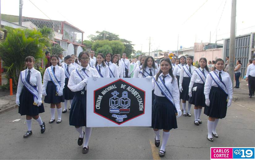 En saludo a las Fiestas Patrias, en el Distrito V, el Ministerio de Educación (Mined), organizó el segundo desfile escolar con un derroche cultural y artístico protagonizado por la banda y gimnasia rítmica, así como estudiantes del Colegio Público 14 de Septiembre, Escuela Normal de Formación Superior Alesio Blandón y Colegio Josefa Toledo de Aguerri.