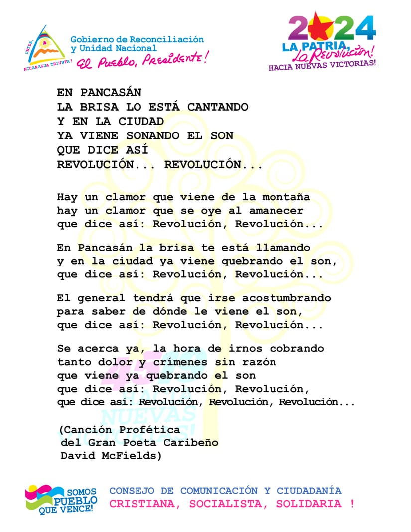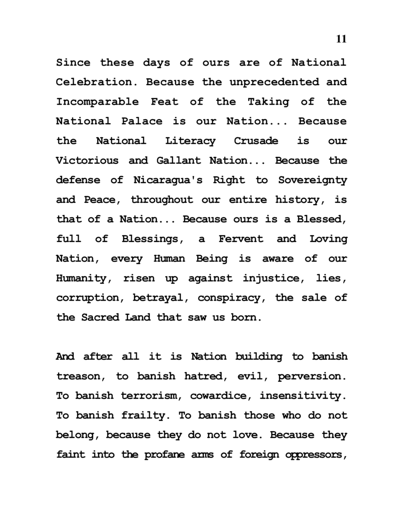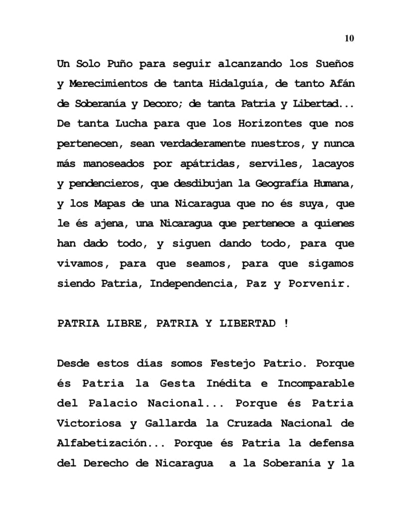 Desde estos días somos Festejo Patrio. Porque és Patria la Gesta Inédita e Incomparable del Palacio Nacional... Porque és Patria Victoriosa y Gallarda la Cruzada Nacional de Alfabetización... Porque és Patria la defensa del Derecho de Nicaragua a la Soberanía y la Paz, a lo largo de toda nuestra Historia... Porque és Patria Bendita, Bendecida, Fervorosa y Amorosa, cada Ser Humano consciente de nuestra Humanidad, alzado contra la injusticia, la mentira, la corrupción, el entreguismo, la conspiración, la venta de la Sagrada Tierra que nos vio nacer.