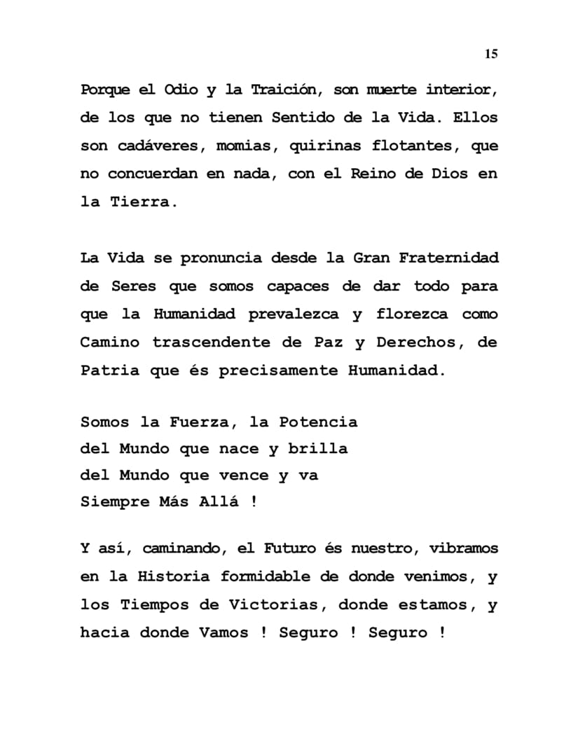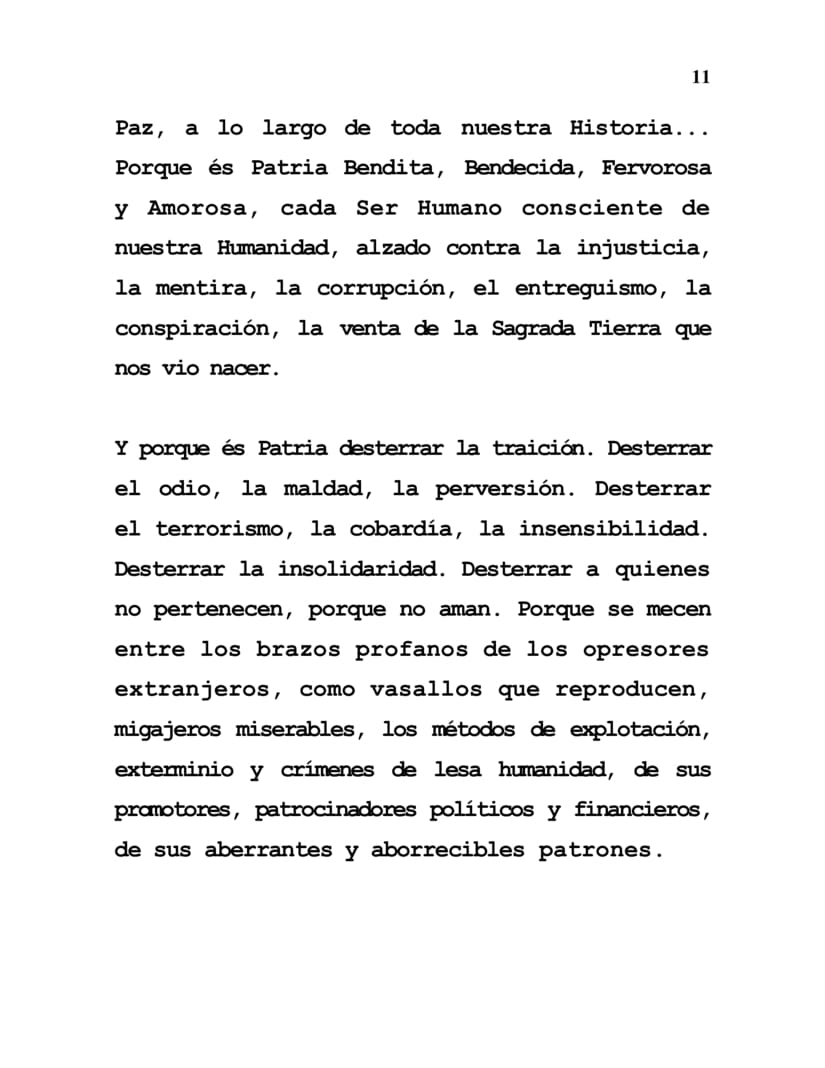 Y porque és Patria desterrar la traición. Desterrar el odio, la maldad, la perversión. Desterrar el terrorismo, la cobardía, la insensibilidad. Desterrar la insolidaridad. Desterrar a quienes no pertenecen, porque no aman. Porque se mecen entre los brazos profanos de los opresores extranjeros, como vasallos que reproducen, migajeros miserables, los métodos de explotación, exterminio y crímenes de lesa humanidad, de sus promotores, patrocinadores políticos y financieros, de sus aberrantes y aborrecibles patrones.