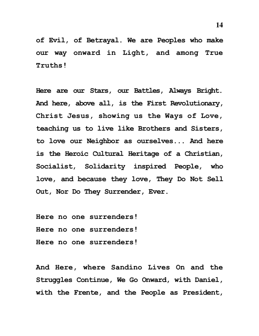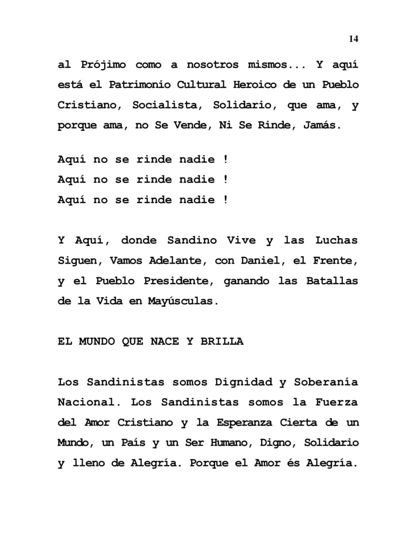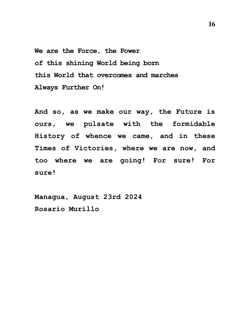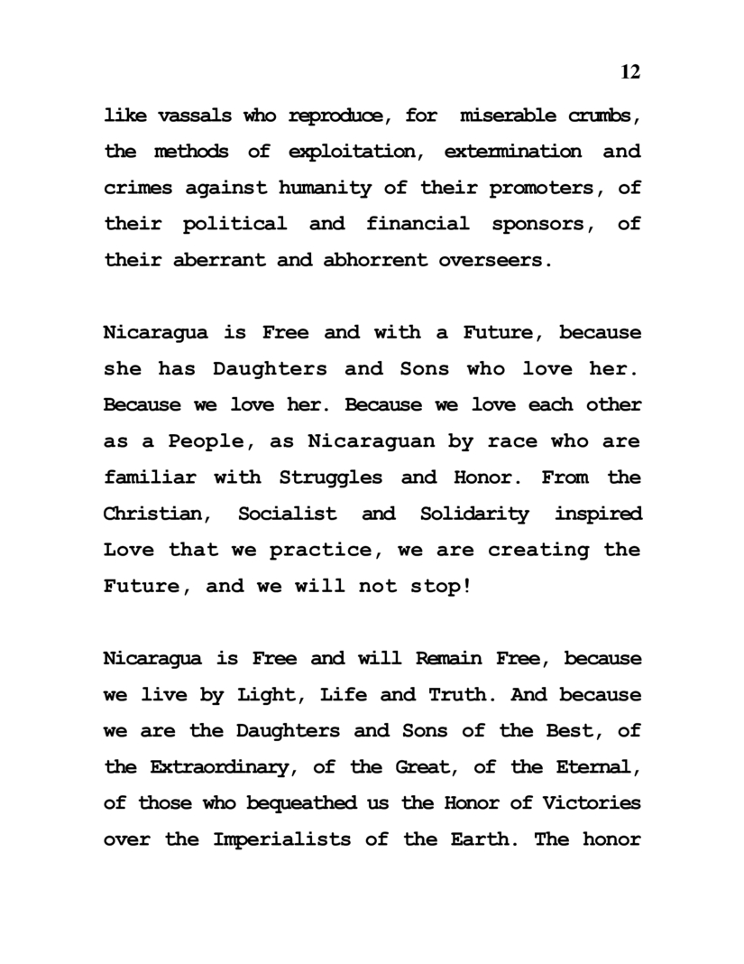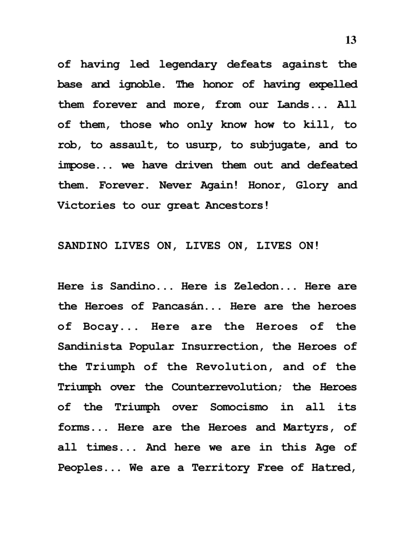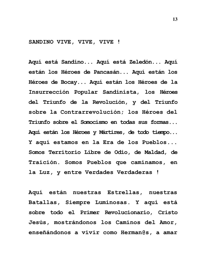 Aquí está Sandino... Aquí está Zeledón... Aquí están los Héroes de Pancasán... Aquí están los Héroes de Bocay... Aquí están los Héroes de la Insurrección Popular Sandinista, los Héroes del Triunfo de la Revolución, y del Triunfo sobre la Contrarrevolución; los Héroes del Triunfo sobre el Somocismo en todas sus formas... Aquí están los Héroes y Mártires, de todo tiempo... Y aquí estamos en la Era de los Pueblos... Somos Territorio Libre de Odio, de Maldad, de Traición. Somos Pueblos que caminamos, en la Luz, y entre Verdades Verdaderas !