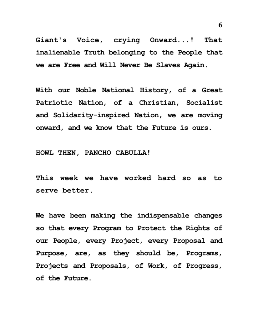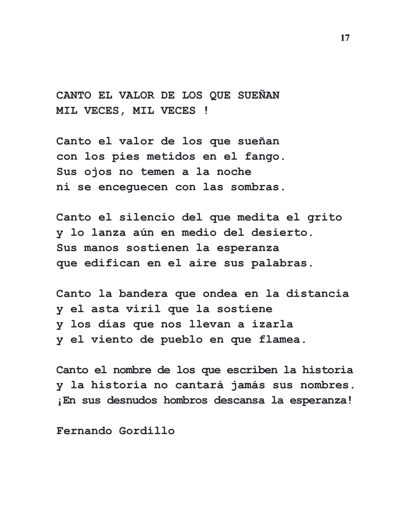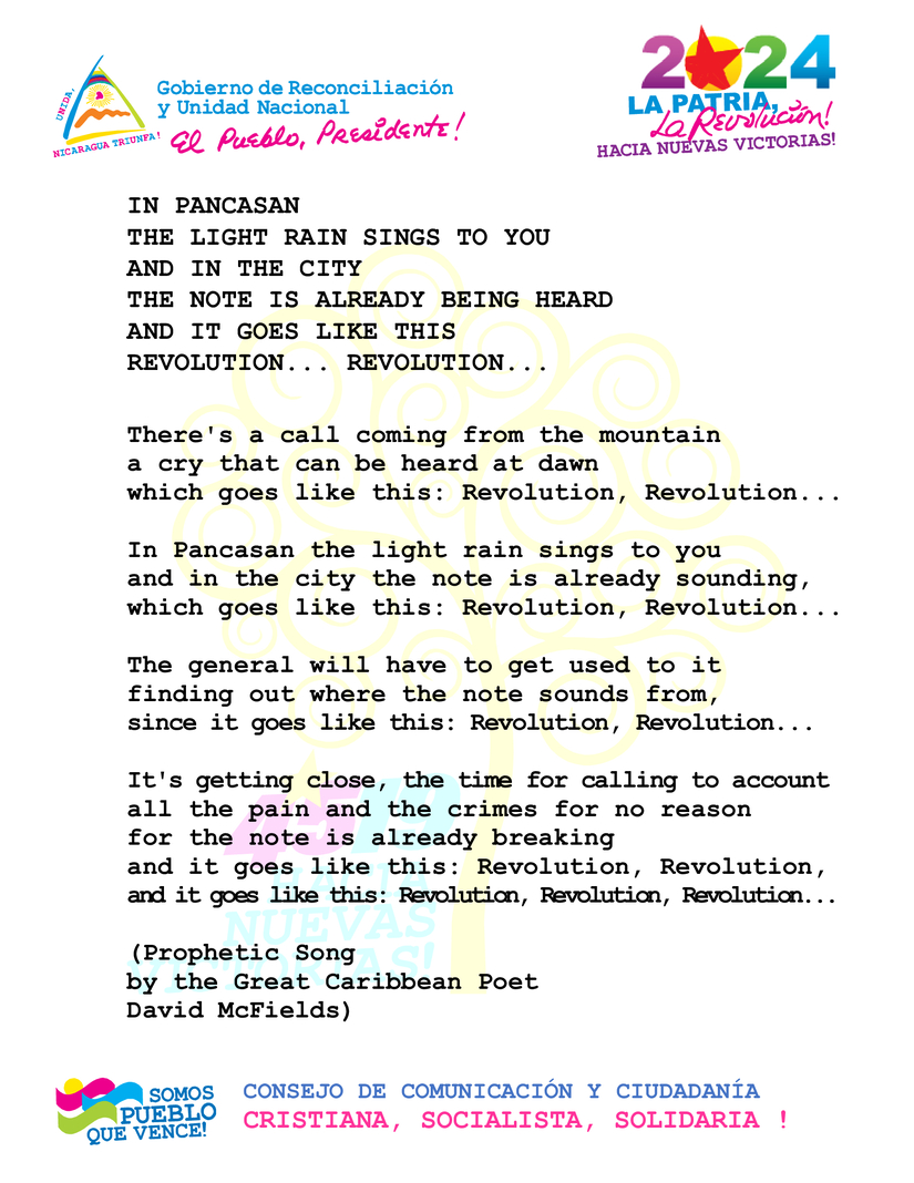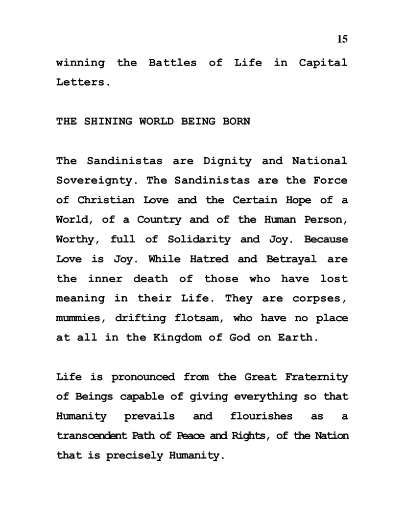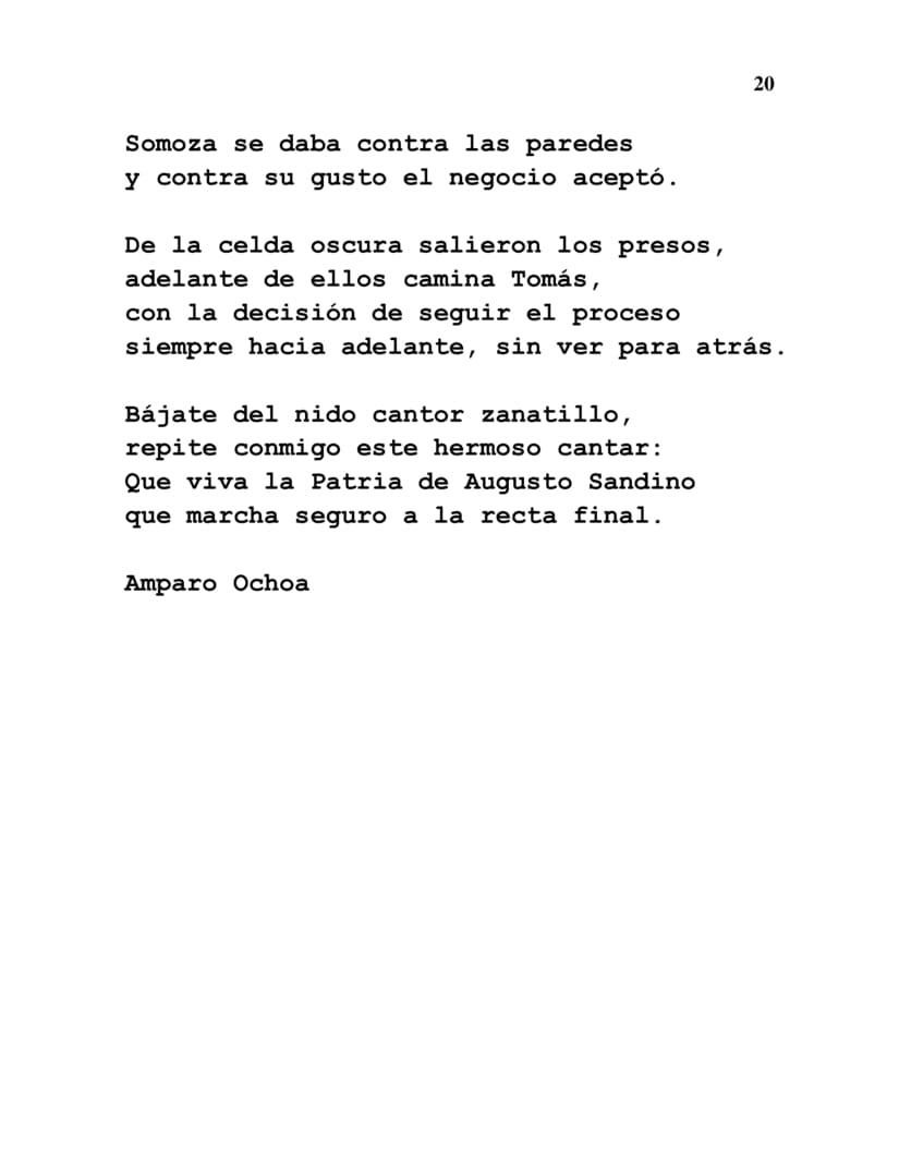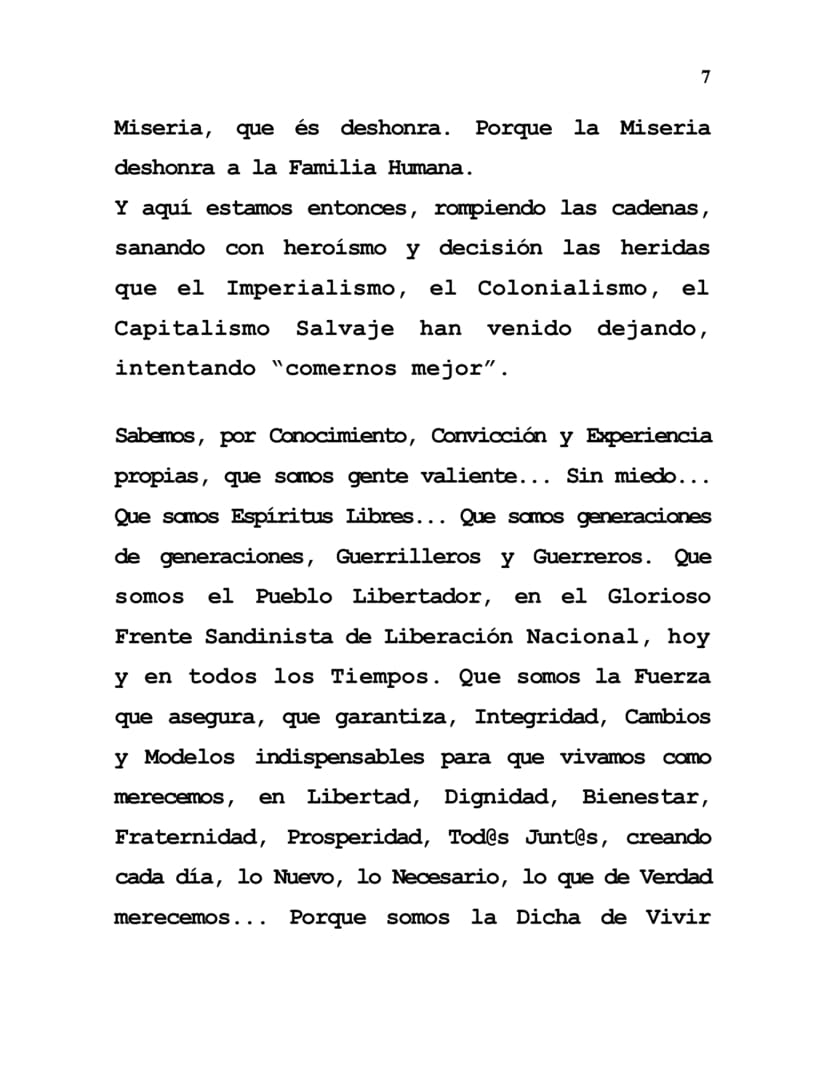Aquí está Sandino... Aquí está Zeledón... Aquí están los Héroes de Pancasán... Aquí están los Héroes de Bocay... Aquí están los Héroes de la Insurrección Popular Sandinista, los Héroes del Triunfo de la Revolución, y del Triunfo sobre la Contrarrevolución; los Héroes del Triunfo sobre el Somocismo en todas sus formas... Aquí están los Héroes y Mártires, de todo tiempo... Y aquí estamos en la Era de los Pueblos... Somos Territorio Libre de Odio, de Maldad, de Traición. Somos Pueblos que caminamos, en la Luz, y entre Verdades Verdaderas !