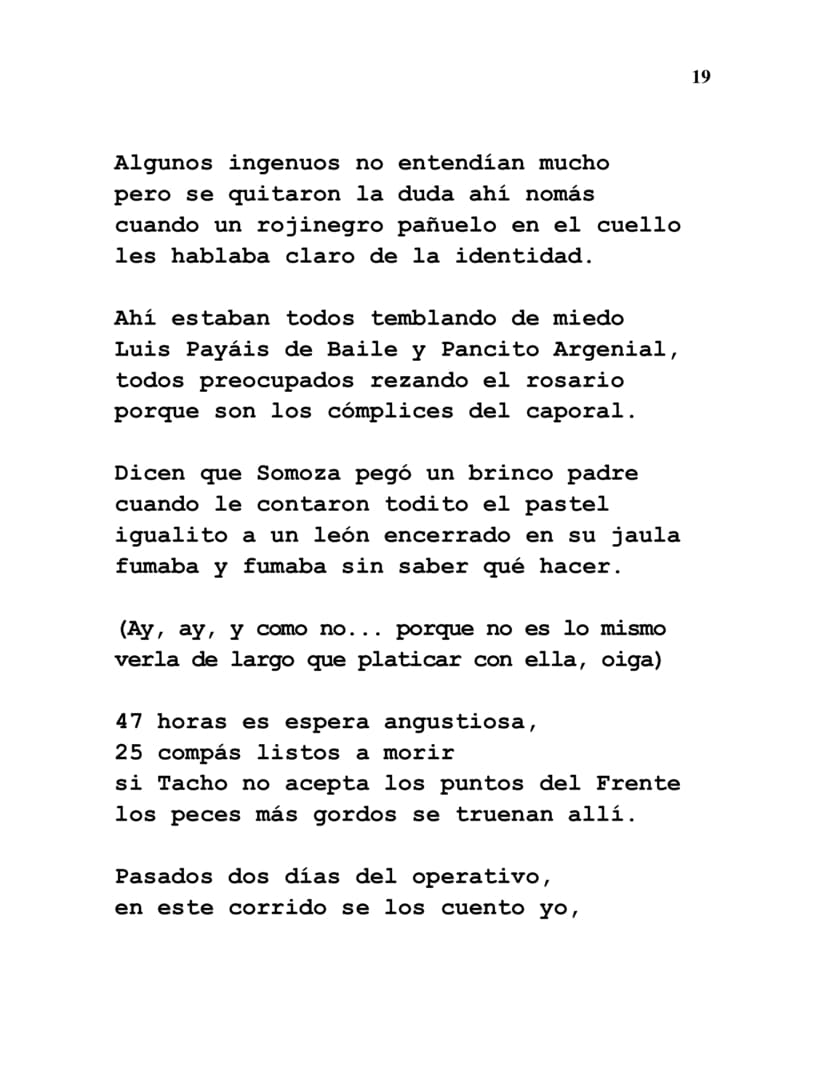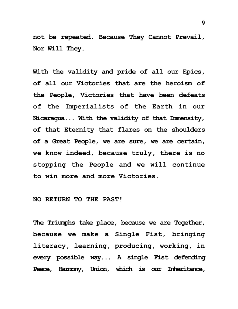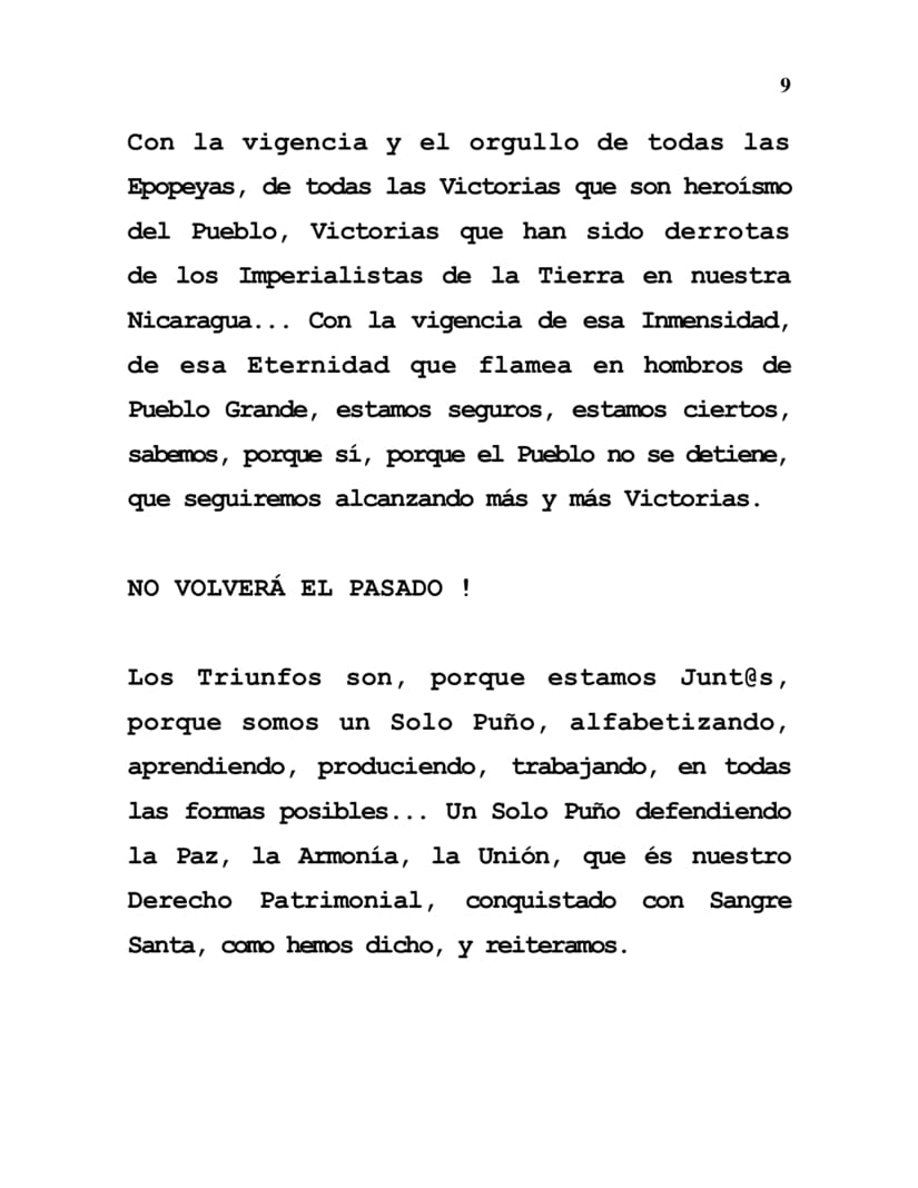 Con la vigencia y el orgullo de todas las Epopeyas, de todas las Victorias que son heroísmo del Pueblo, Victorias que han sido derrotas de los Imperialistas de la Tierra en nuestra Nicaragua... Con la vigencia de esa Inmensidad, de esa Eternidad que flamea en hombros de Pueblo Grande, estamos seguros, estamos ciertos, sabemos, porque sí, porque el Pueblo no se detiene, que seguiremos alcanzando más y más Victorias.