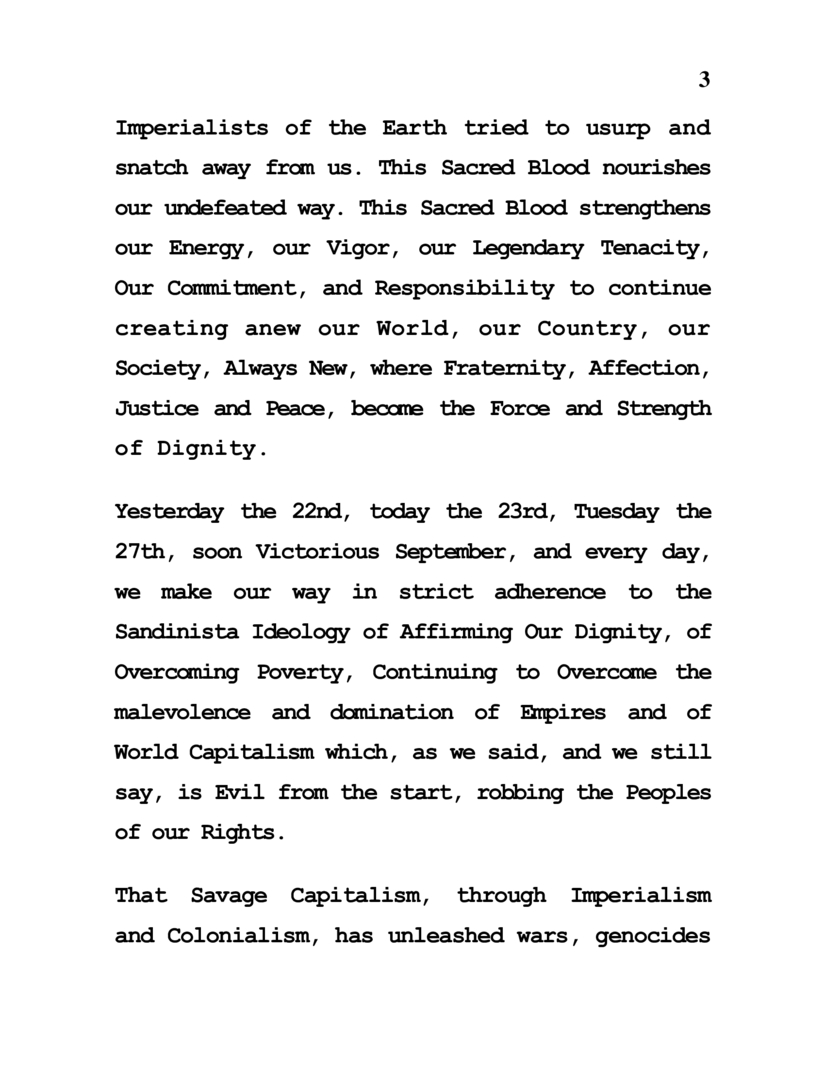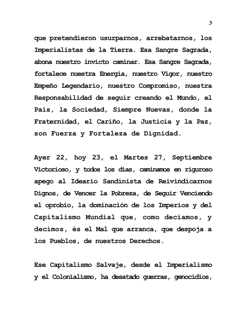 Ayer 22, hoy 23, el Martes 27, Septiembre Victorioso, y todos los días, caminamos en riguroso apego al Ideario Sandinista de Reivindicarnos Dignos, de Vencer la Pobreza, de Seguir Venciendo el oprobio, la dominación de los Imperios y del Capitalismo Mundial que, como decíamos, y decimos, és el Mal que arranca, que despoja a los Pueblos, de nuestros Derechos.