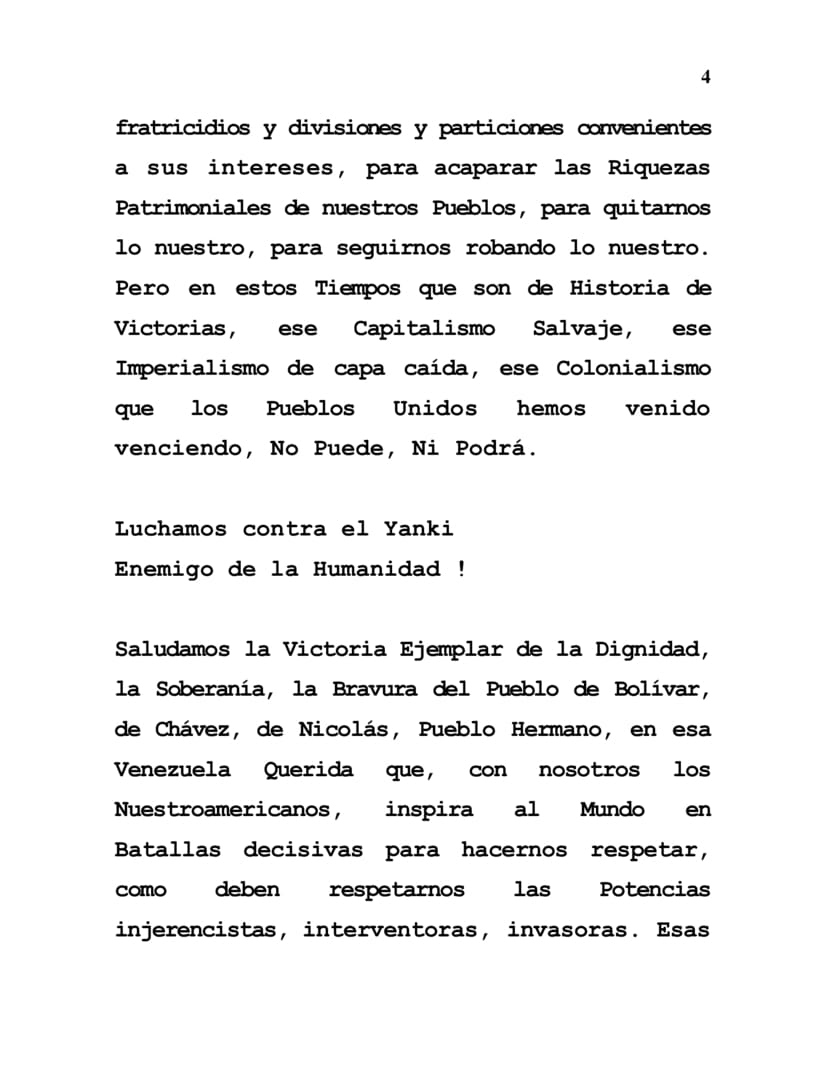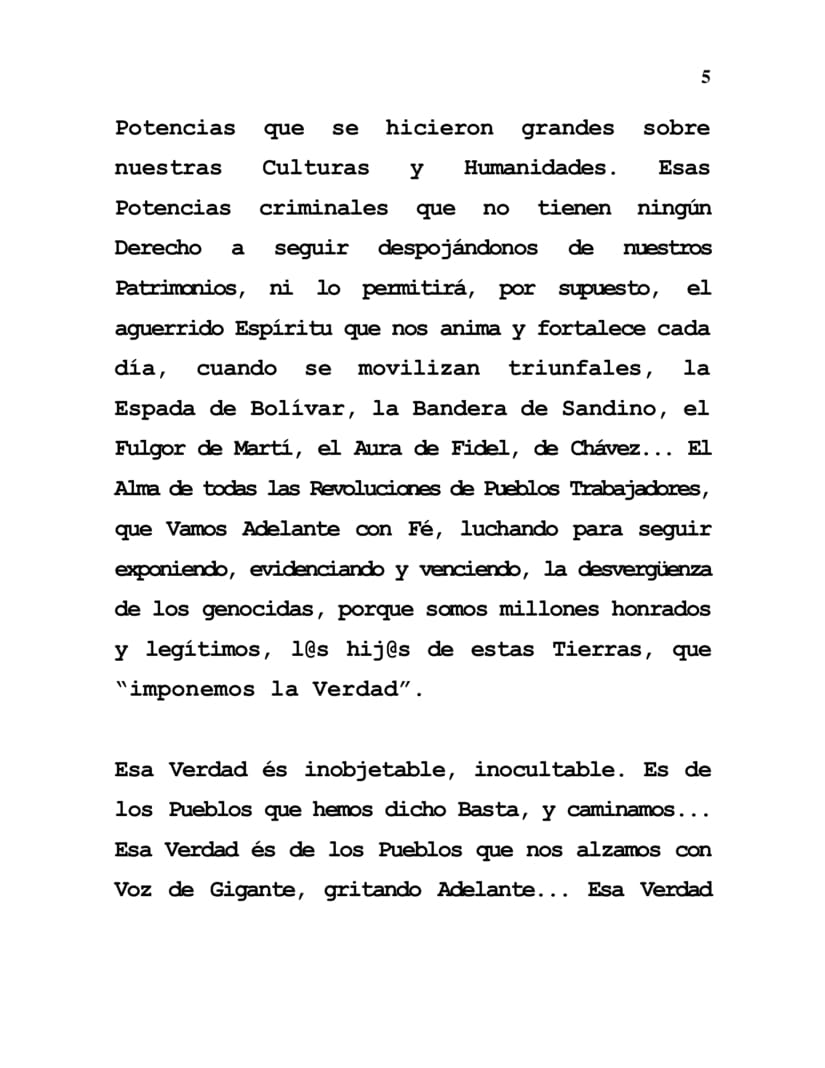 Saludamos la Victoria Ejemplar de la Dignidad, la Soberanía, la Bravura del Pueblo de Bolívar, de Chávez, de Nicolás, Pueblo Hermano, en esa Venezuela Querida que, con nosotros los Nuestroamericanos, inspira al Mundo en Batallas decisivas para hacernos respetar, como deben respetarnos las Potencias injerencistas, interventoras, invasoras. Esas Potencias que se hicieron grandes sobre nuestras Culturas y Humanidades. Esas Potencias criminales que no tienen ningún Derecho a seguir despojándonos de nuestros Patrimonios, ni lo permitirá, por supuesto, el aguerrido Espíritu que nos anima y fortalece cada día, cuando se movilizan triunfales, la Espada de Bolívar, la Bandera de Sandino, el Fulgor de Martí, el Aura de Fidel, de Chávez... El Alma de todas las Revoluciones de Pueblos Trabajadores, que Vamos Adelante con Fé, luchando para seguir exponiendo, evidenciando y venciendo, la desvergüenza de los genocidas, porque somos millones honrados y legítimos, l@s hij@s de estas Tierras, que “imponemos la Verdad”.