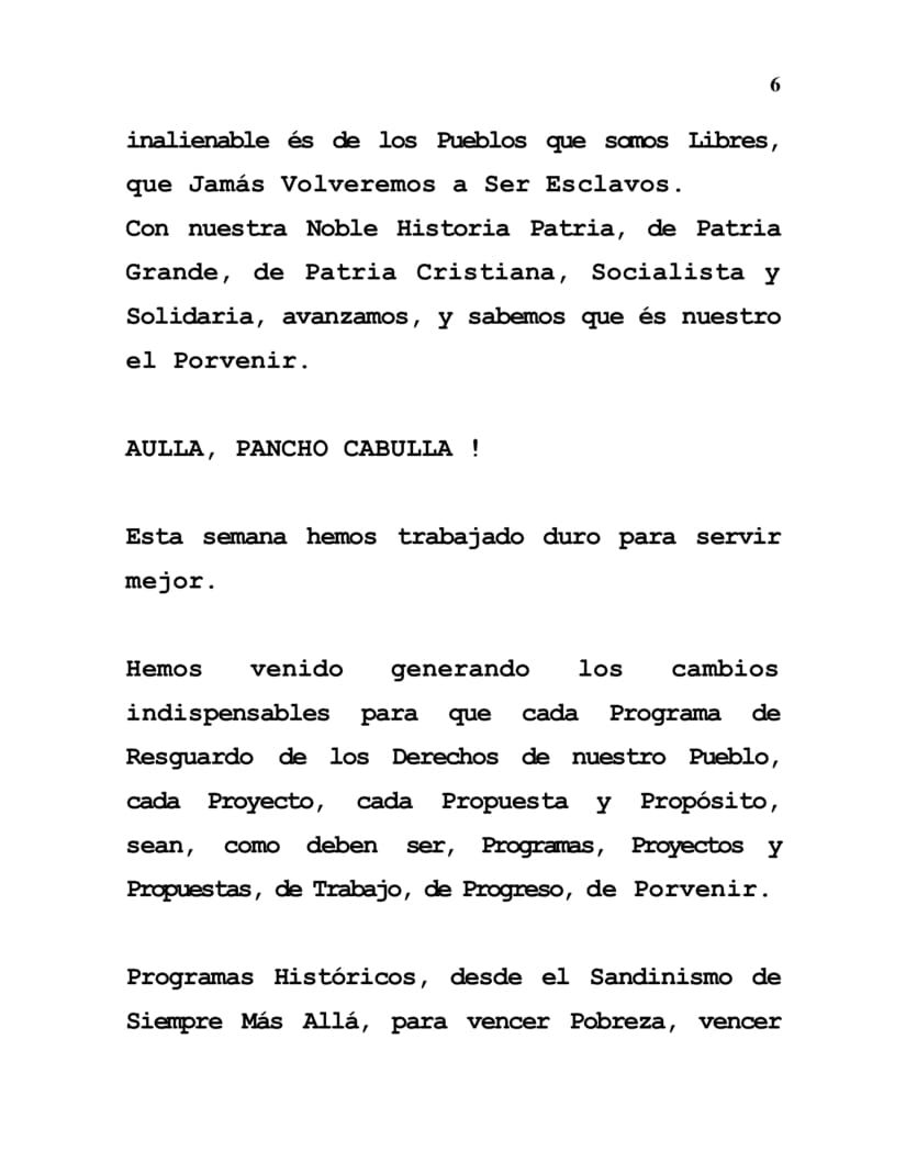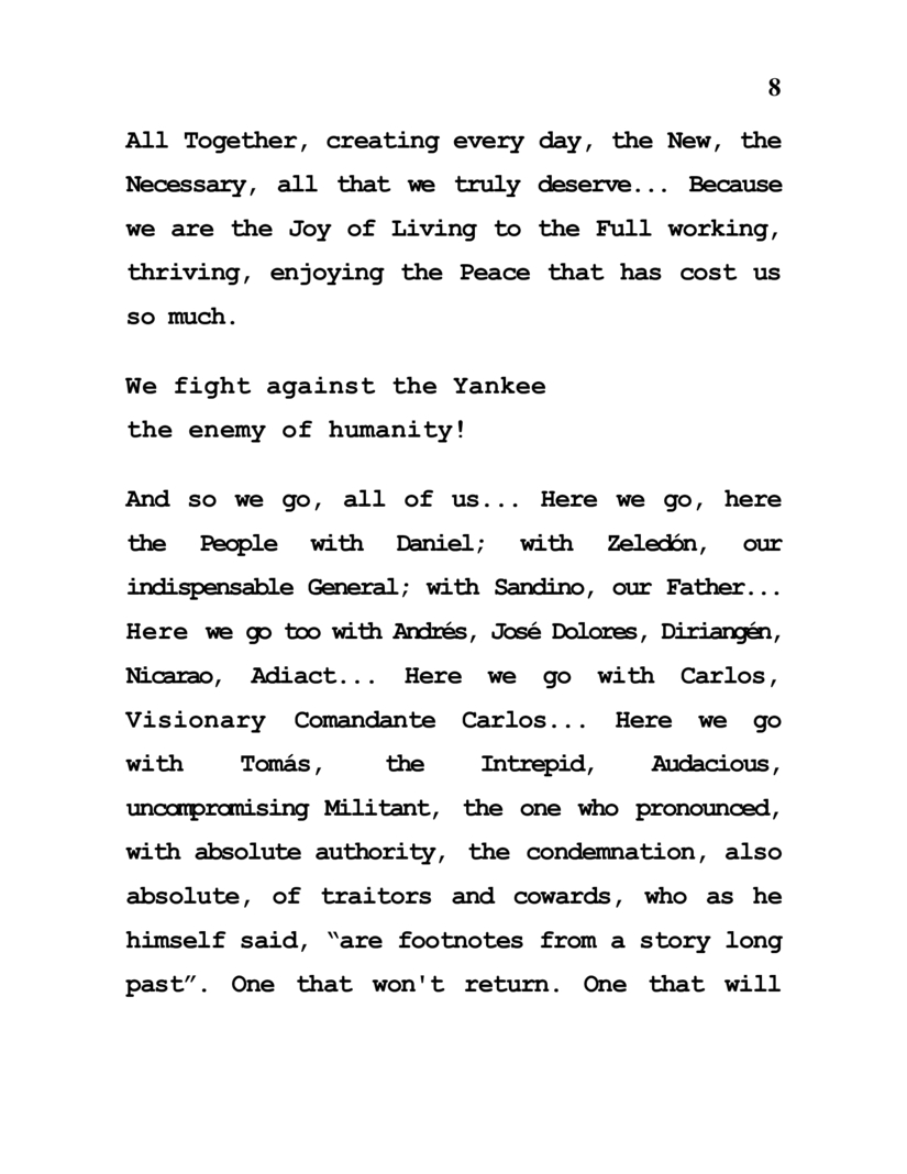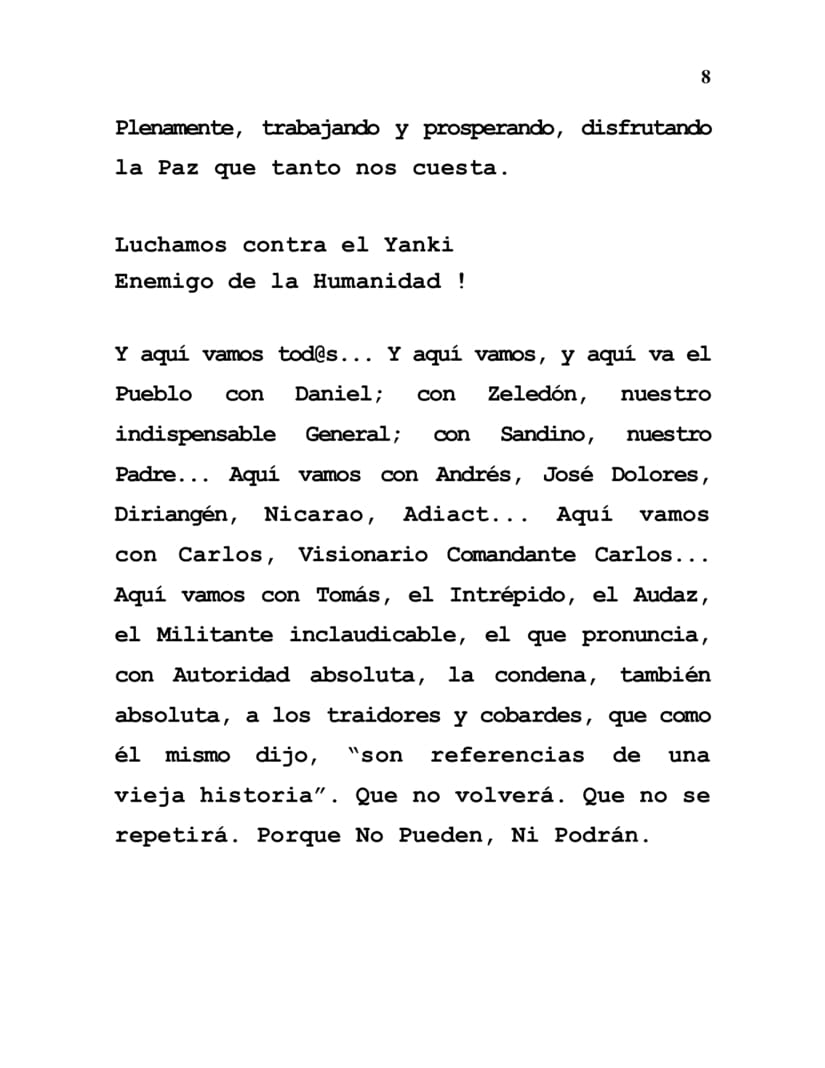 Y aquí vamos tod@s... Y aquí vamos, y aquí va el Pueblo con Daniel; con Zeledón, nuestro indispensable General; con Sandino, nuestro Padre... Aquí vamos con Andrés, José Dolores, Diriangén, Nicarao, Adiact... Aquí vamos con Carlos, Visionario Comandante Carlos... Aquí vamos con Tomás, el Intrépido, el Audaz, el Militante inclaudicable, el que pronuncia, con Autoridad absoluta, la condena, también absoluta, a los traidores y cobardes, que como él mismo dijo, “son referencias de una vieja historia”. Que no volverá. Que no se repetirá. Porque No Pueden, Ni Podrán.