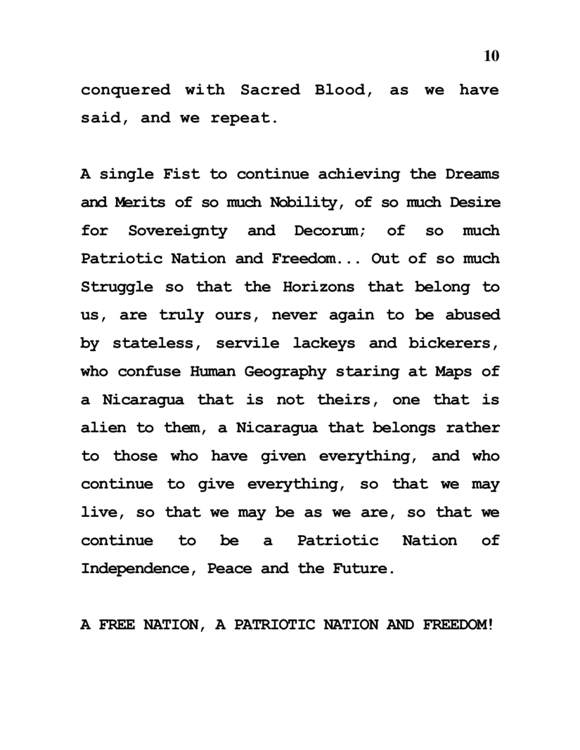 Un Solo Puño para seguir alcanzando los Sueños y Merecimientos de tanta Hidalguía, de tanto Afán de Soberanía y Decoro; de tanta Patria y Libertad... De tanta Lucha para que los Horizontes que nos pertenecen, sean verdaderamente nuestros, y nunca más manoseados por apátridas, serviles, lacayos y pendencieros, que desdibujan la Geografía Humana, y los Mapas de una Nicaragua que no és suya, que le és ajena, una Nicaragua que pertenece a quienes han dado todo, y siguen dando todo, para que vivamos, para que seamos, para que sigamos siendo Patria, Independencia, Paz y Porvenir.