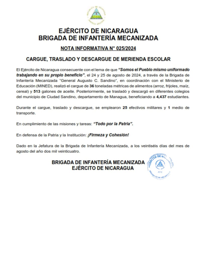 El Ejército de Nicaragua consecuente con el lema de que “Somos el Pueblo mismo uniformado trabajando en su propio beneficio”, el 24 y 25 de agosto de 2024, a través de la Brigada de Infantería Mecanizada “General Augusto C. Sandino”, en coordinación con el Ministerio de Educación (MINED), realizó el cargue de 36 toneladas métricas de alimentos (arroz, frijoles, maíz, cereal) y 513 galones de aceite. Posteriormente, se trasladó y descargó en diferentes colegios del municipio de Ciudad Sandino, departamento de Managua, beneficiando a 4,437 estudiantes.