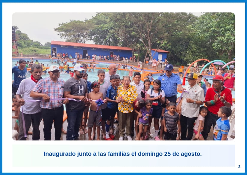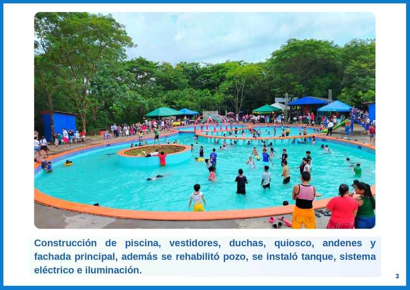 Compartimos Galería Fotográfica del nuevo Parque Familiar Acuático en El Viejo, Chinandega, que cuenta con piscina, vestidores, duchas, quiosco, andenes y fachada principal, además se rehabilitó pozo, se instaló tanque, sistema eléctrico e iluminación.