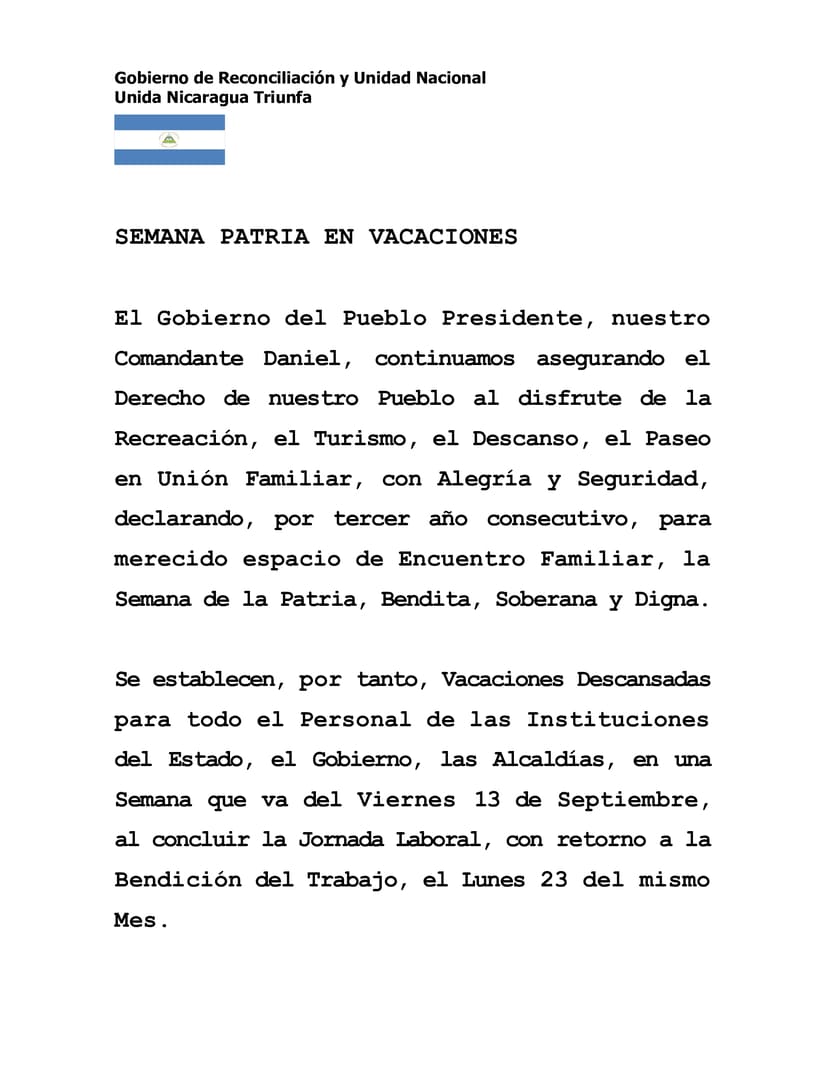 Se establecen, por tanto, Vacaciones Descansadas para todo el Personal de las Instituciones del Estado, el Gobierno, las Alcaldías, en una Semana que va del Viernes 13 de Septiembre, al concluir la Jornada Laboral, con retorno a la Bendición del Trabajo, el Lunes 23 del mismo Mes.