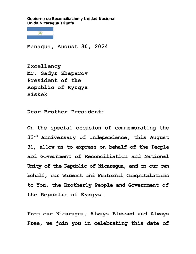 Desde nuestra Nicaragua, Siempre Bendita y Siempre Libre, celebramos junto a Usted esta Fecha de Victorias, Soberanía Nacional e Independencia, reiterando nuestro compromiso de continuar fortaleciendo los memorables Lazos de Amistad y Cooperación con el Hermano Pueblo y Gobierno de Kirguisa.