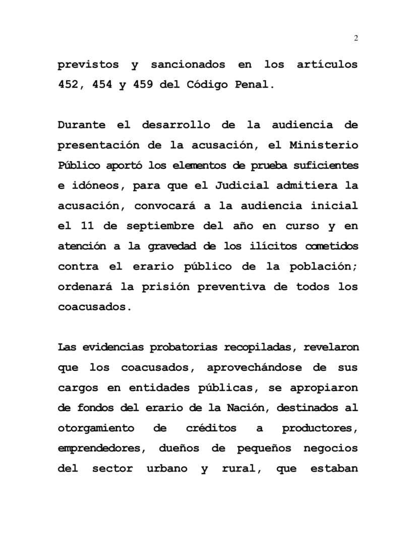 Durante el desarrollo de la audiencia de presentación de la acusación, el Ministerio Público aportó los elementos de prueba suficientes e idóneos, para que el Judicial admitiera la acusación, convocará a la audiencia inicial el 11 de septiembre del año en curso y en atención a la gravedad de los ilícitos cometidos contra el erario público de la población; ordenará la prisión preventiva de todos los coacusados.
