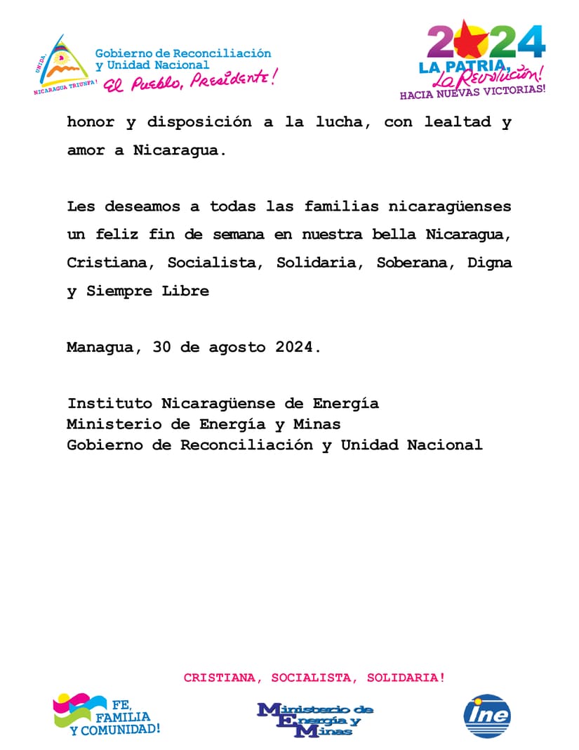 El Presidente de la República, Comandante Daniel Ortega Saavedra y nuestra Vicepresidenta Compañera Rosario Murillo, dado el incremento constante que desde el año 2021 han tenido los precios internacionales del petróleo y sus derivados, los cuales afectan las economías de todos los países, pensando siempre en el apoyo a las familias nicaragüenses y en las tareas diarias que realiza nuestro pueblo relacionadas con la producción, el transporte colectivo y las diversas actividades económicas del país, han instruido al Ministerio de Energía y Minas y al Instituto Nicaragüense de Energía, informar a las familias nicaragüenses que para la próxima semana que va del 1 al 7 de septiembre 2024, de acuerdo con los precios internacionales de los derivados del petróleo, los ajustes que se requieran no serán aplicados, manteniéndose los precios locales de los combustibles gasolinas y diésel sin variación, para beneficio de las familias nicaragüenses.