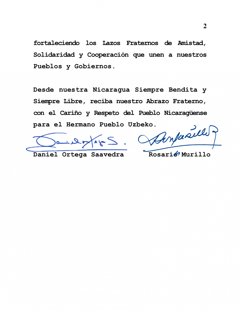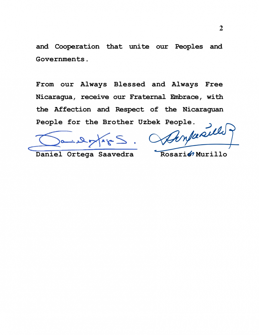 Desde nuestra Nicaragua Siempre Bendita y Siempre Libre, reciba nuestro Abrazo Fraterno, con el Cariño y Respeto del Pueblo Nicaragüense para el Hermano Pueblo Uzbeko.