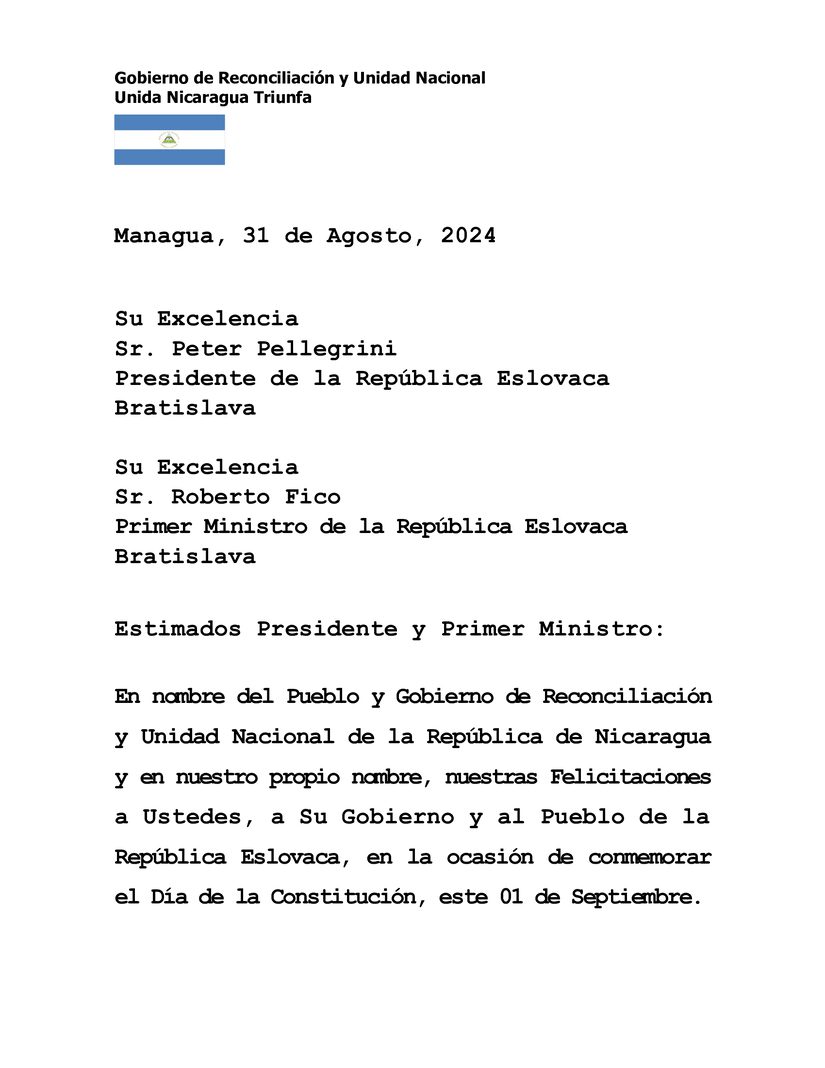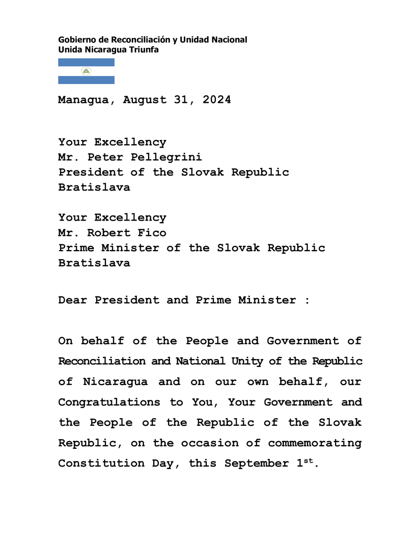 En nombre del Pueblo y Gobierno de Reconciliación y Unidad Nacional de la República de Nicaragua y en nuestro propio nombre, nuestras Felicitaciones a Ustedes, a Su Gobierno y al Pueblo de la República Eslovaca, en la ocasión de conmemorar el Día de la Constitución, este 01 de Septiembre.