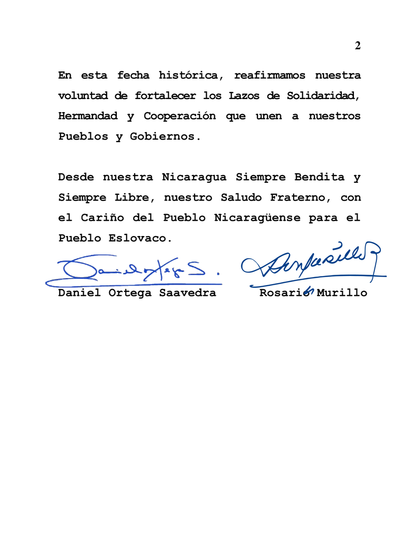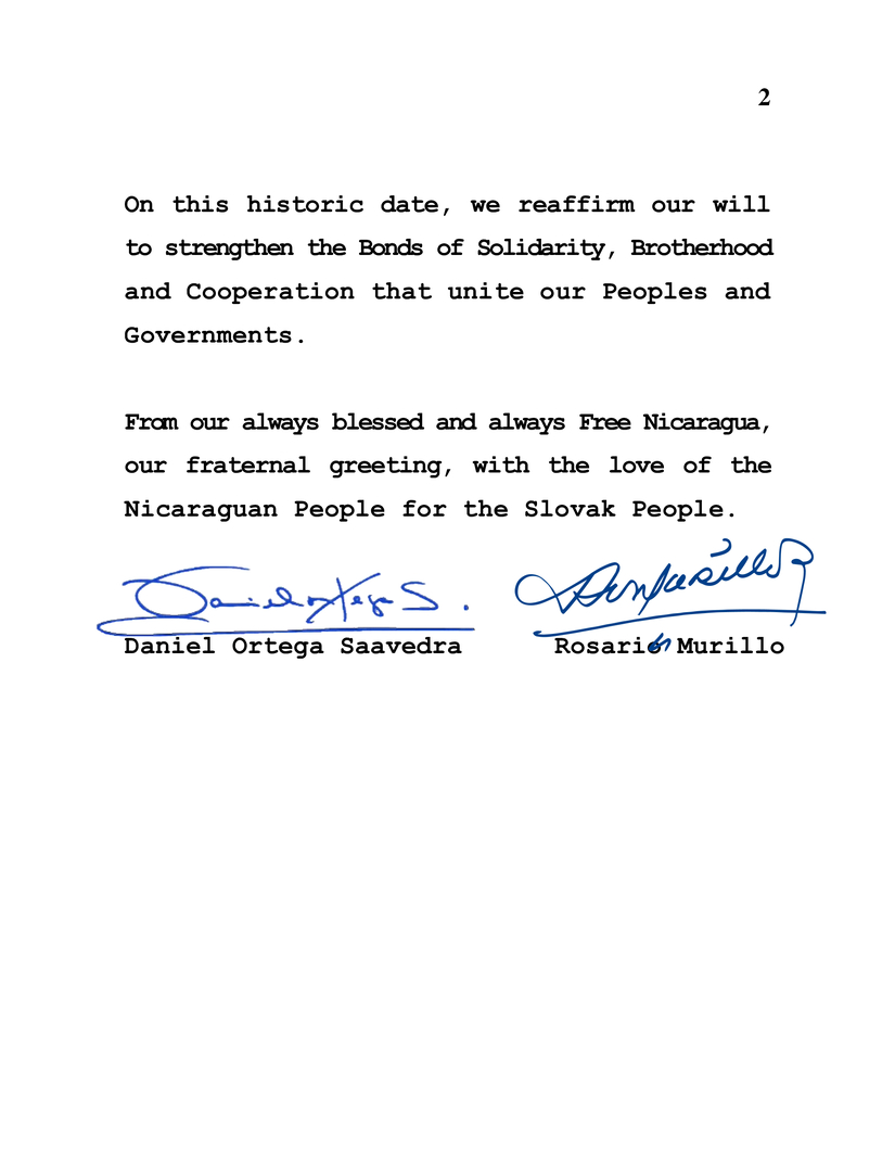 Desde nuestra Nicaragua Siempre Bendita y Siempre Libre, nuestro Saludo Fraterno, con el Cariño del Pueblo Nicaragüense para el Pueblo Eslovaco.