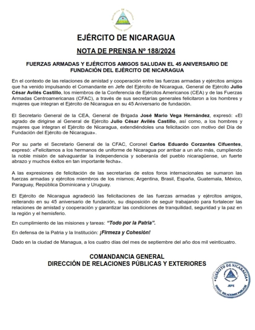 El Secretario General de la CEA, General de Brigada José Mario Vega Hernández, expresó: «El agrado de dirigirse al General de Ejército Julio César Avilés Castillo, así como, a los hombres y mujeres que integran el Ejército de Nicaragua, extendiéndoles una felicitación con motivo del Día de Fundación del Ejército de Nicaragua».