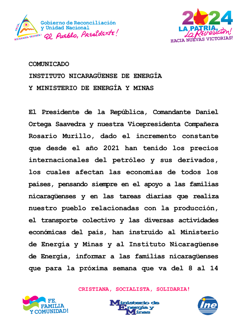 El Presidente de la República, Comandante Daniel Ortega Saavedra y nuestra Vicepresidenta Compañera Rosario Murillo, dado el incremento constante que desde el año 2021 han tenido los precios internacionales del petróleo y sus derivados, los cuales afectan las economías de todos los países, pensando siempre en el apoyo a las familias nicaragüenses y en las tareas diarias que realiza nuestro pueblo relacionadas con la producción, el transporte colectivo y las diversas actividades económicas del país, han instruido al Ministerio de Energía y Minas y al Instituto Nicaragüense de Energía, informar a las familias nicaragüenses que para la próxima semana que va del 8 al 14 de septiembre 2024, de acuerdo con los precios internacionales de los derivados del petróleo, los ajustes que se requieran no serán aplicados, manteniéndose los precios locales de los combustibles gasolinas y diésel sin variación, para beneficio de las familias nicaragüenses.