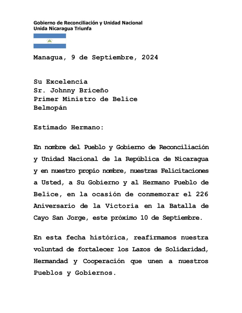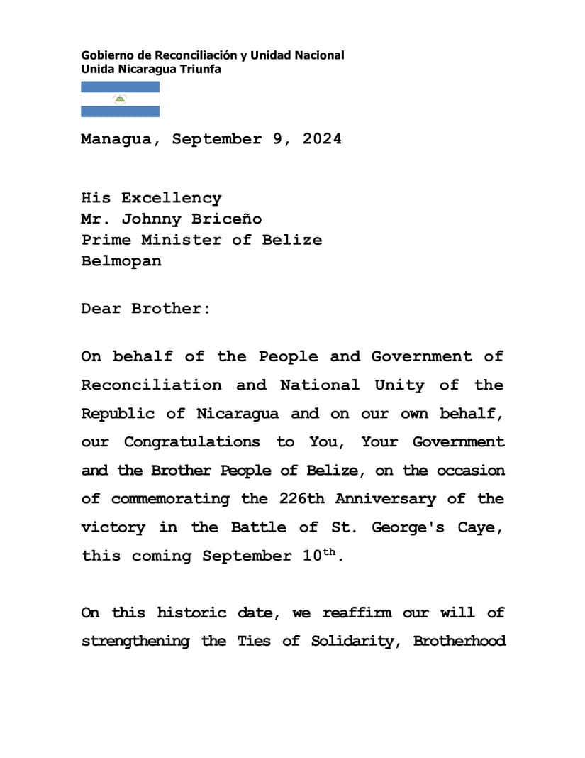 En nombre del Pueblo y Gobierno de Reconciliación y Unidad Nacional de la República de Nicaragua y en nuestro propio nombre, nuestras Felicitaciones a Usted, a Su Gobierno y al Hermano Pueblo de Belice, en la ocasión de conmemorar el 226 Aniversario de la Victoria en la Batalla de Cayo San Jorge, este próximo 10 de Septiembre.