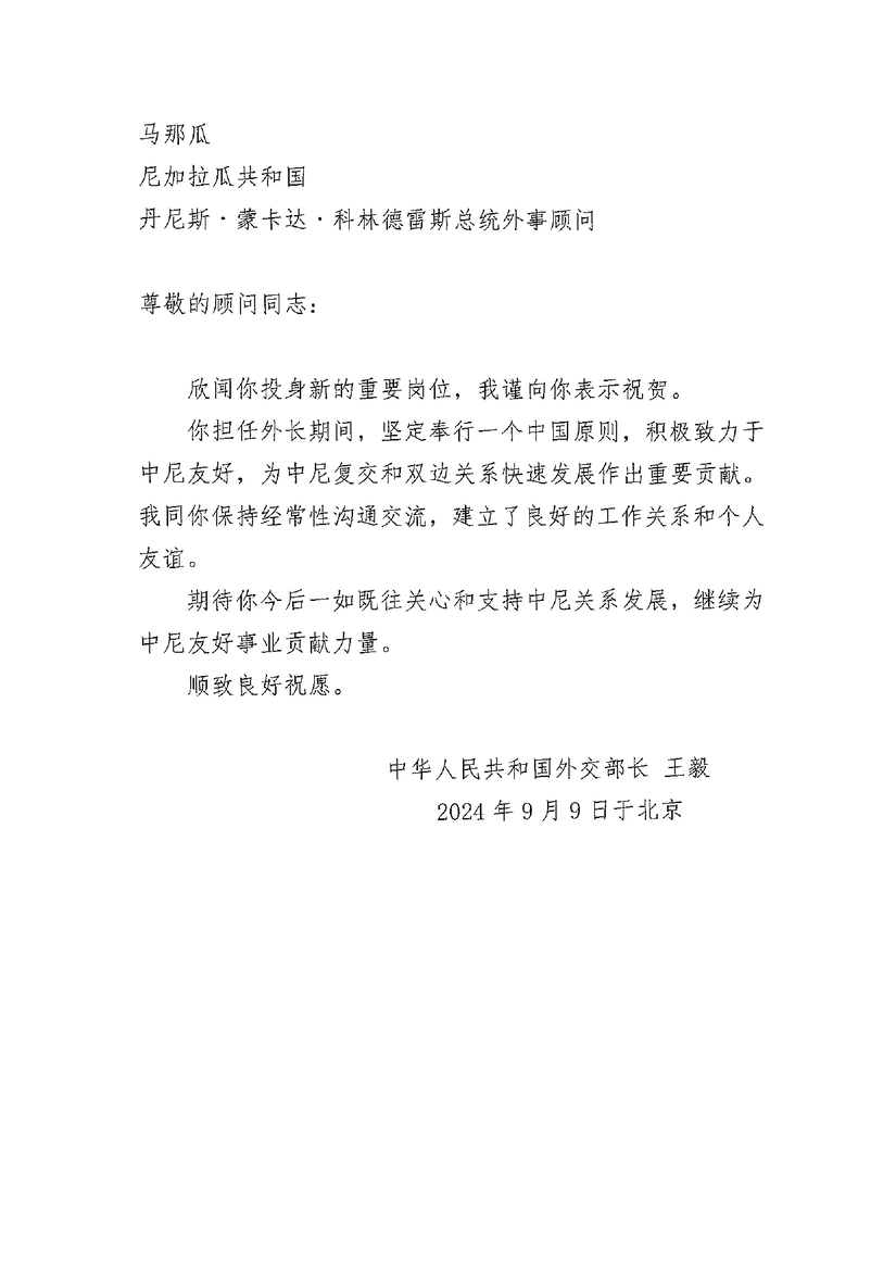 Agradecemos sus Buenos Deseos y damos a conocer el texto de su Mensaje con Fraternal Reconocimiento. Igualmente, agradecemos la Carta de Saludo que el Compañero Wang Yi, Ministro de Relaciones Exteriores de la República Popular China, nos ha remitido para el Compañero Denis Moncada.