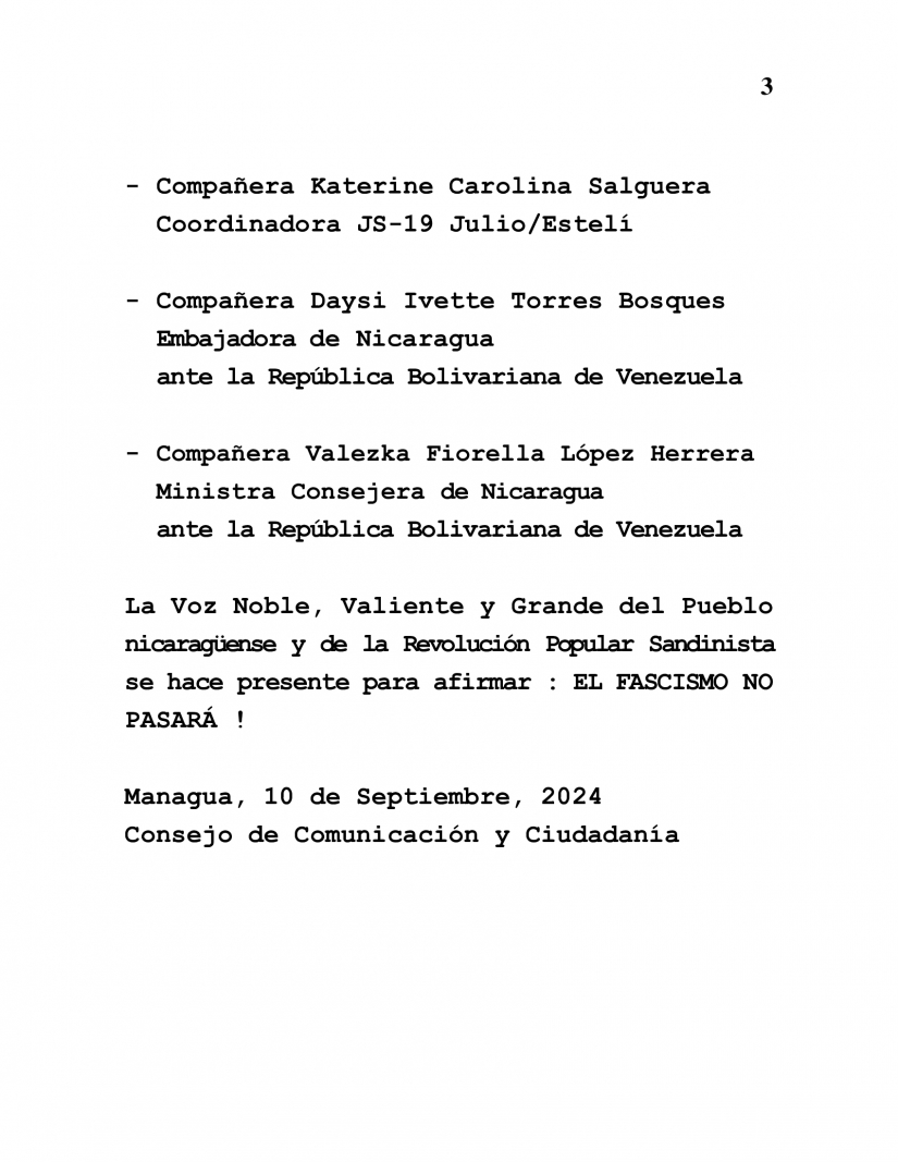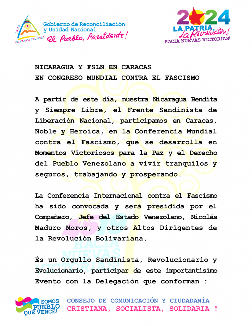 A partir de este día, nuestra Nicaragua Bendita y Siempre Libre, el Frente Sandinista de Liberación Nacional, participamos en Caracas, Noble y Heroica, en la Conferencia Mundial contra el Fascismo, que se desarrolla en Momentos Victoriosos para la Paz y el Derecho del Pueblo Venezolano a vivir tranquilos y seguros, trabajando y prosperando.