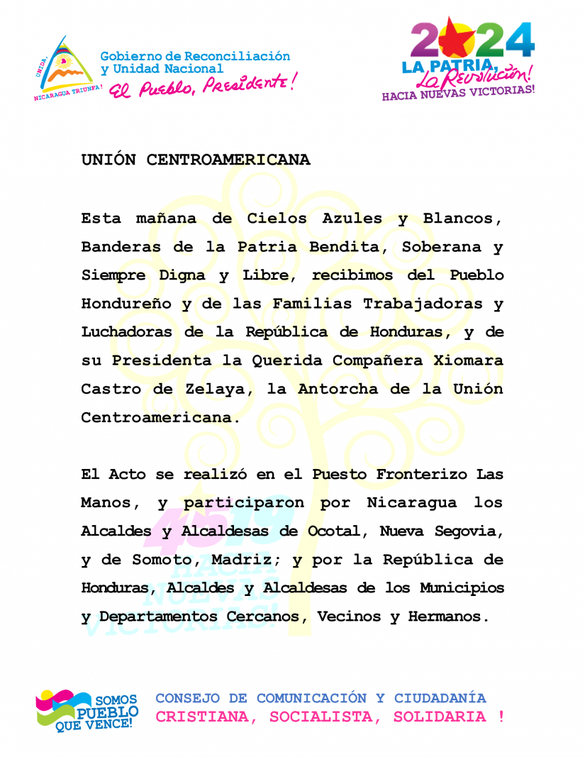 Esta mañana de Cielos Azules y Blancos, Banderas de la Patria Bendita, Soberana y Siempre Digna y Libre, recibimos del Pueblo Hondureño y de las Familias Trabajadoras y Luchadoras de la República de Honduras, y de su Presidenta la Querida Compañera Xiomara Castro de Zelaya, la Antorcha de la Unión Centroamericana.