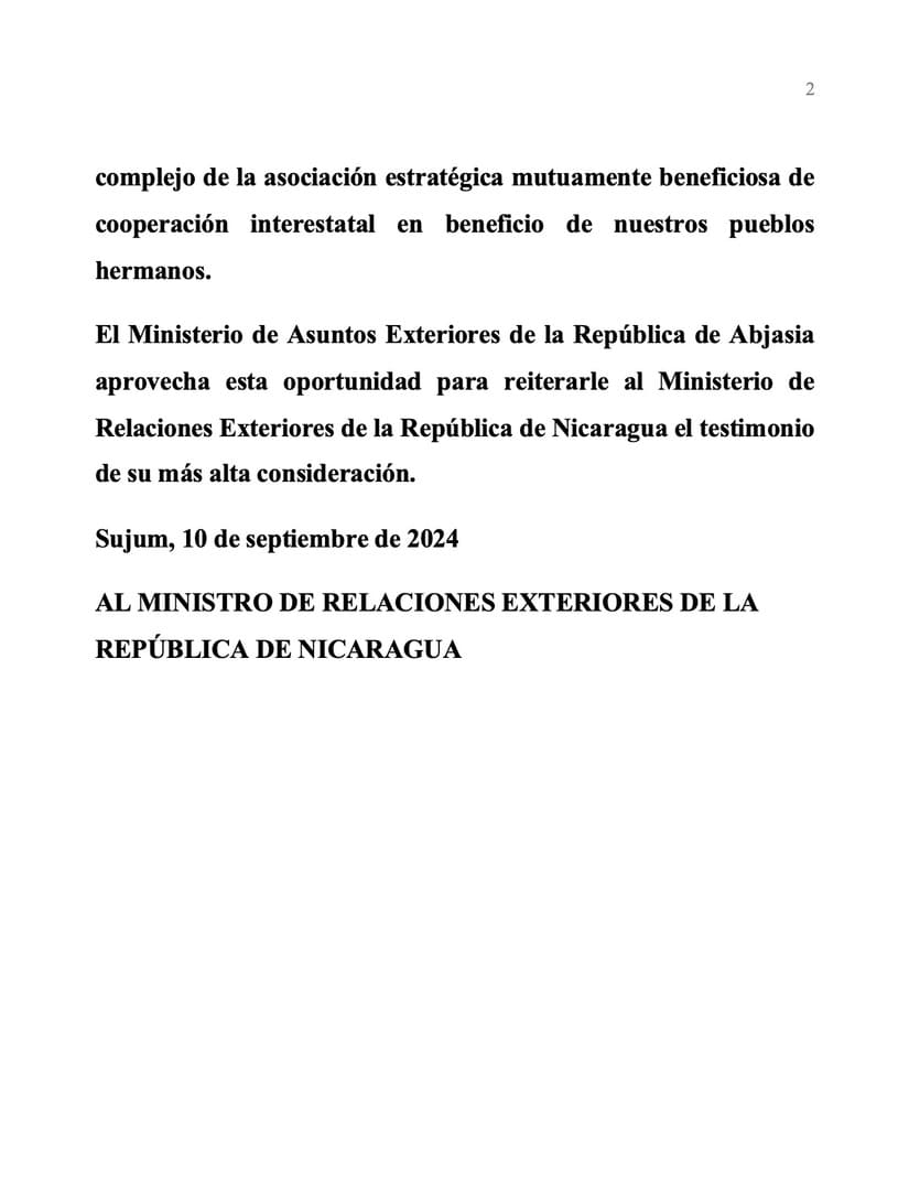 El Ministerio de Asuntos Exteriores de la República de Abjasia aprovecha esta oportunidad para reiterarle al Ministerio de Relaciones Exteriores de la República de Nicaragua el testimonio de su más alta consideración.