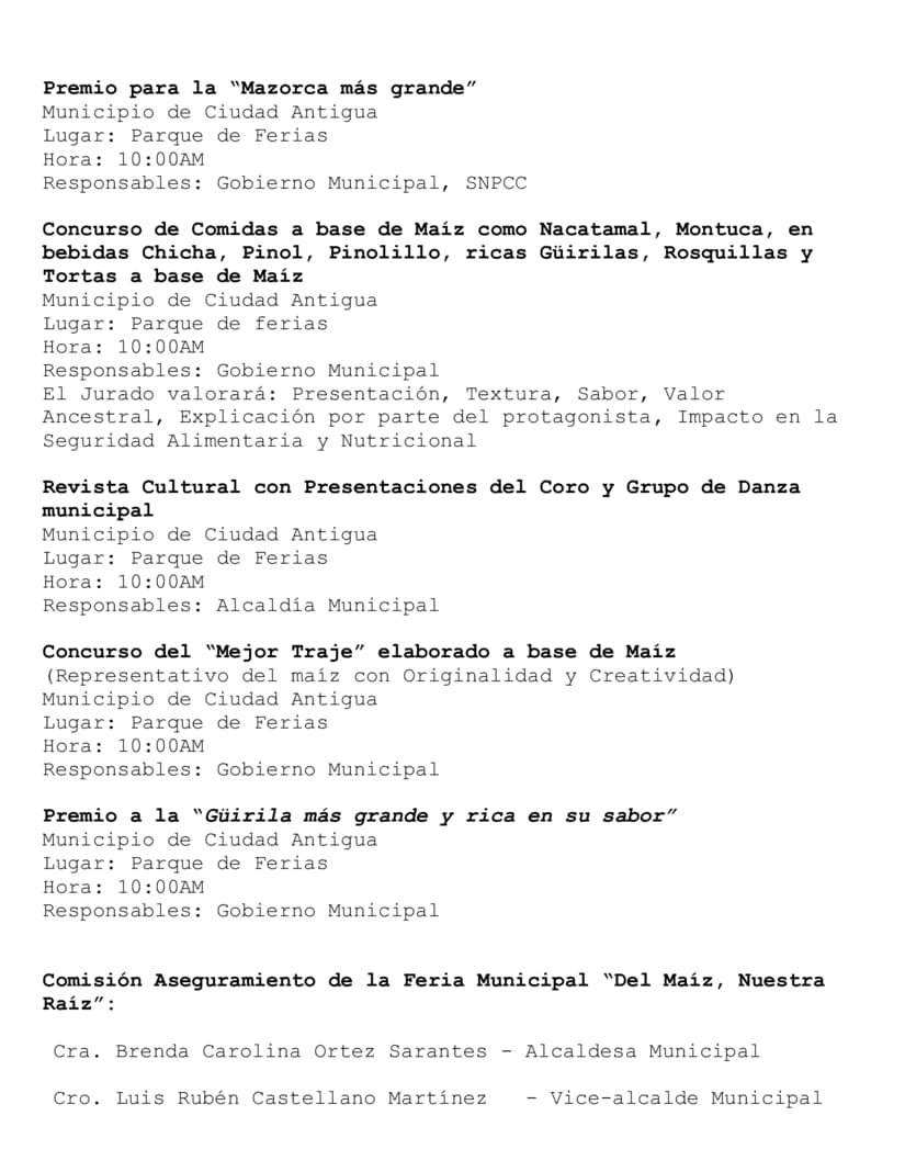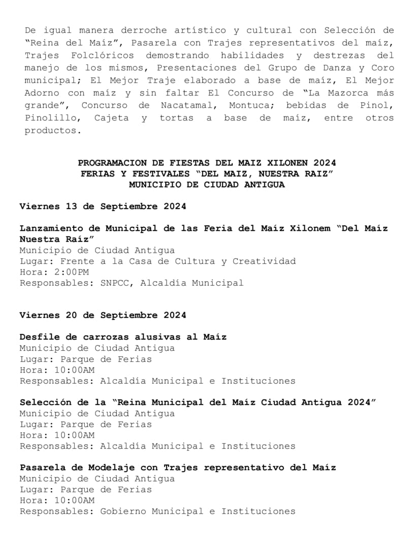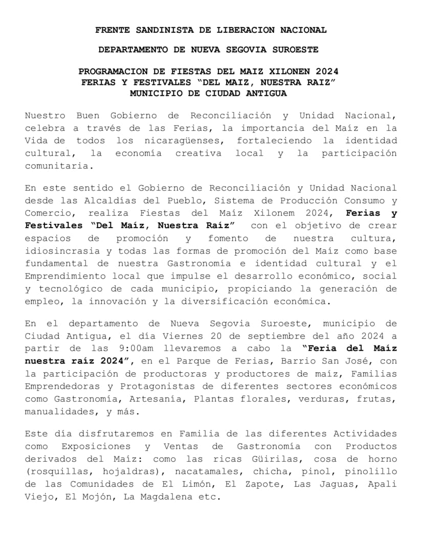 Programación de las Fiestas del Maíz Xilonem 2024 a realizarse en los municipios de Santa María , Ocotal, Dipilto y Ciudad Antigua el día 20 de Septiembre.