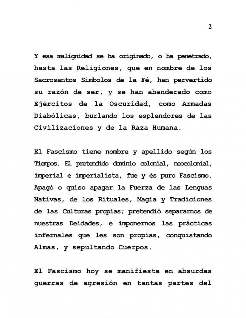 Fascism has a name and a surname depending on the Era. The so-called colonial, neocolonial, imperial and imperialist domination was and is pure Fascism. It snuffed out or wanted to snuff out the Power of Native Languages, of the Rituals, Magic and Traditions of our Peoples' own Cultures; trying to separate us from our Deities, and impose on us their own infernal practices, looting our Souls as they buried our Bodies.