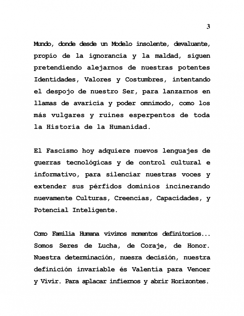Fascism today manifests itself in irrational wars of aggression in so many parts of the World, where by means of a contemptuous, derogatory Model, so typical of ignorance and evil, they continue trying to separate us from our powerful Identities, Values and Customs, trying to dispossess our very Being, launching us into flames of greed and all-encompassing power, as the most base and dastardly monstrosities have done throughout Humanity's entire history.