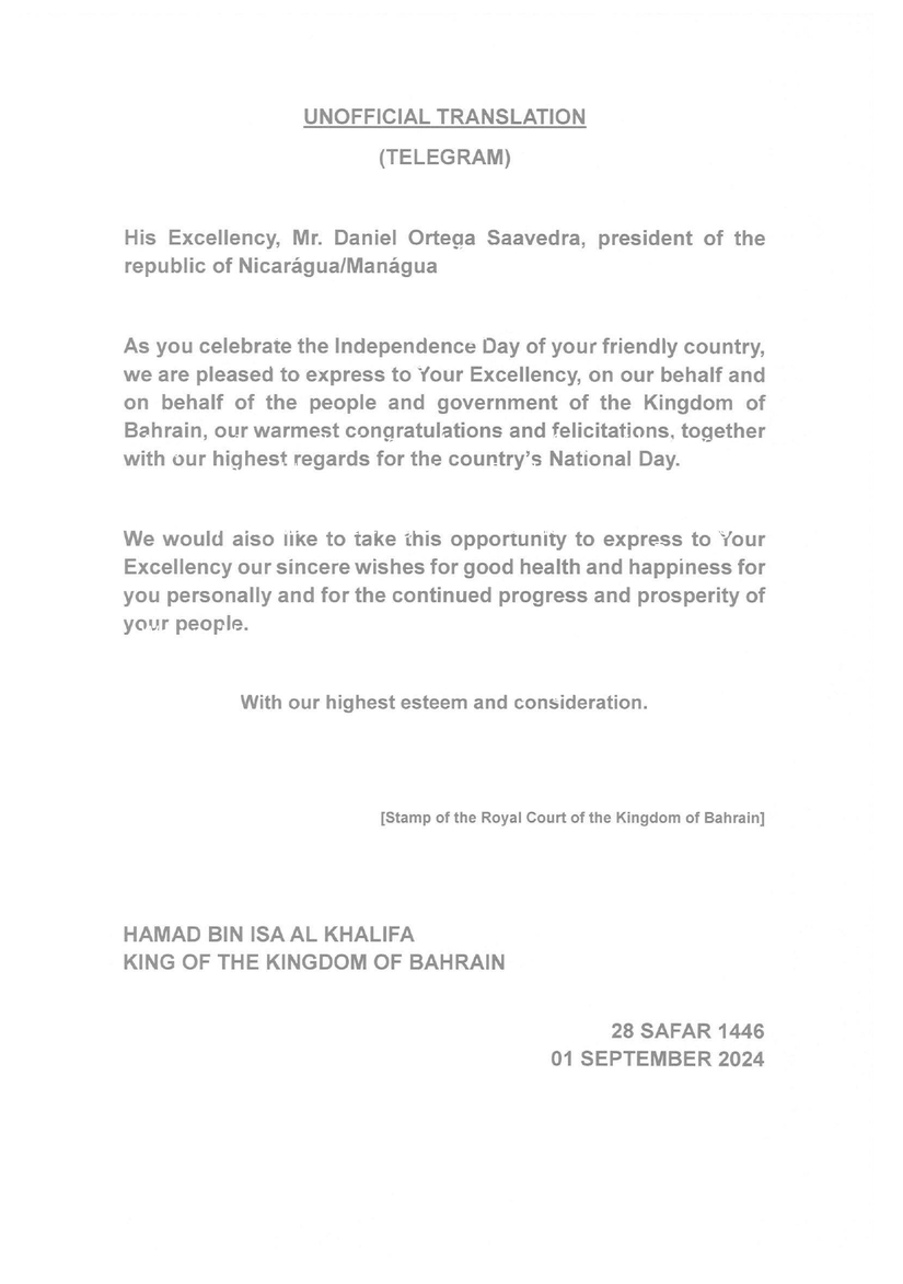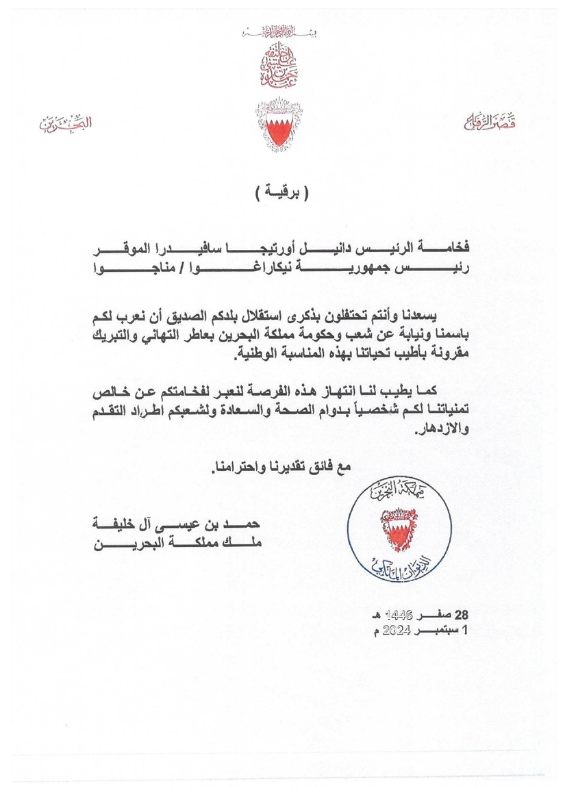 Mensaje de Felicitación de Su Majestad Hamad Bin Isa Al Khalifa, Rey de Bahréin, con motivo del Día de la Independencia de Nicaragua.